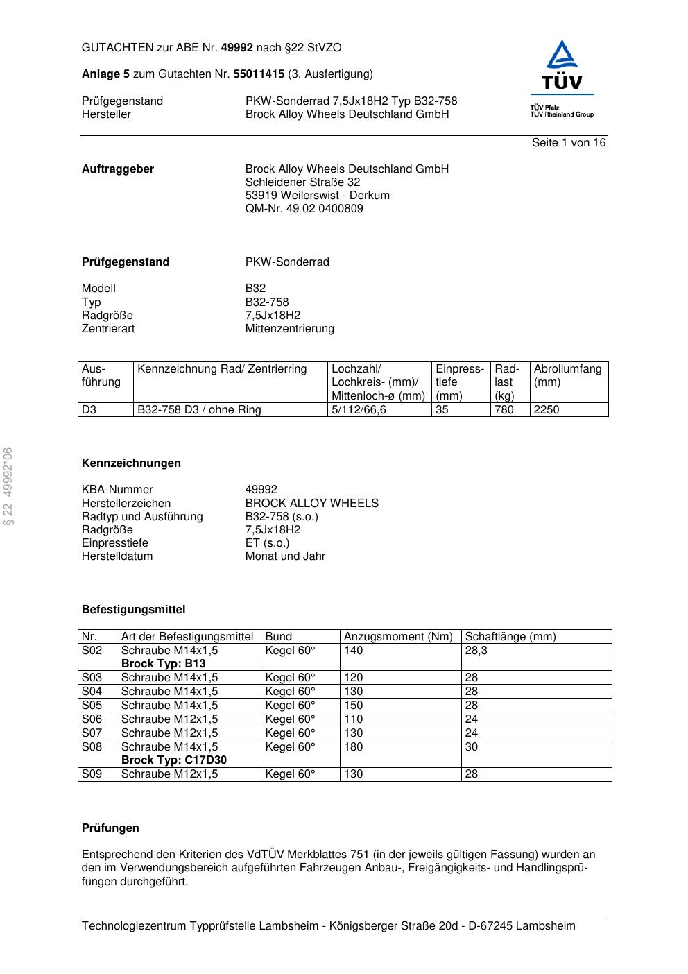 Dieses Gutachten (abe) bezieht sich auf die Alufelge Brock B32-758 in der Ausführung 7.5Jx18 ET 0, Mittenloch 0 mm (KBA 49992). Im PDF findest du typischerweise zulässige Reifengrößen, Auflagen/Anbauhinweise und – je nach Dokument – Hinweise zur Eintragung.