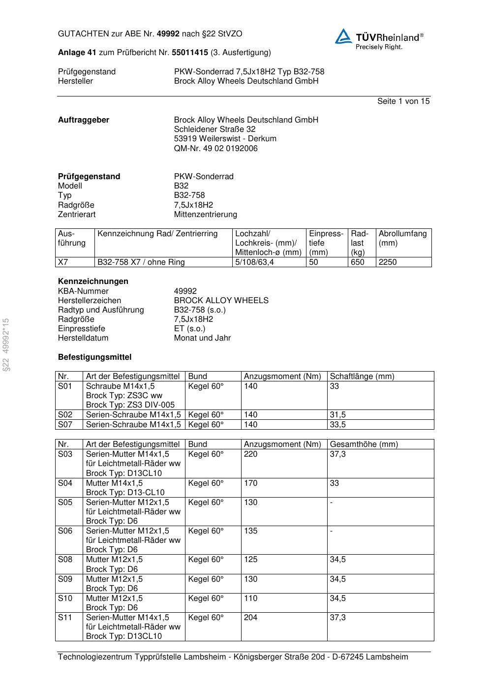 Felgengutachten / abe für Alufelgen Brock B32-758 (7.5Jx18 ET 0, Mittenloch 0 mm) mit KBA 49992 (Zertifikatsnummer 49992). Hier kostenlos als PDF herunterladen. Der Download-Link ist 24 Stunden gültig und kann bis zu zwei Mal verwendet werden.