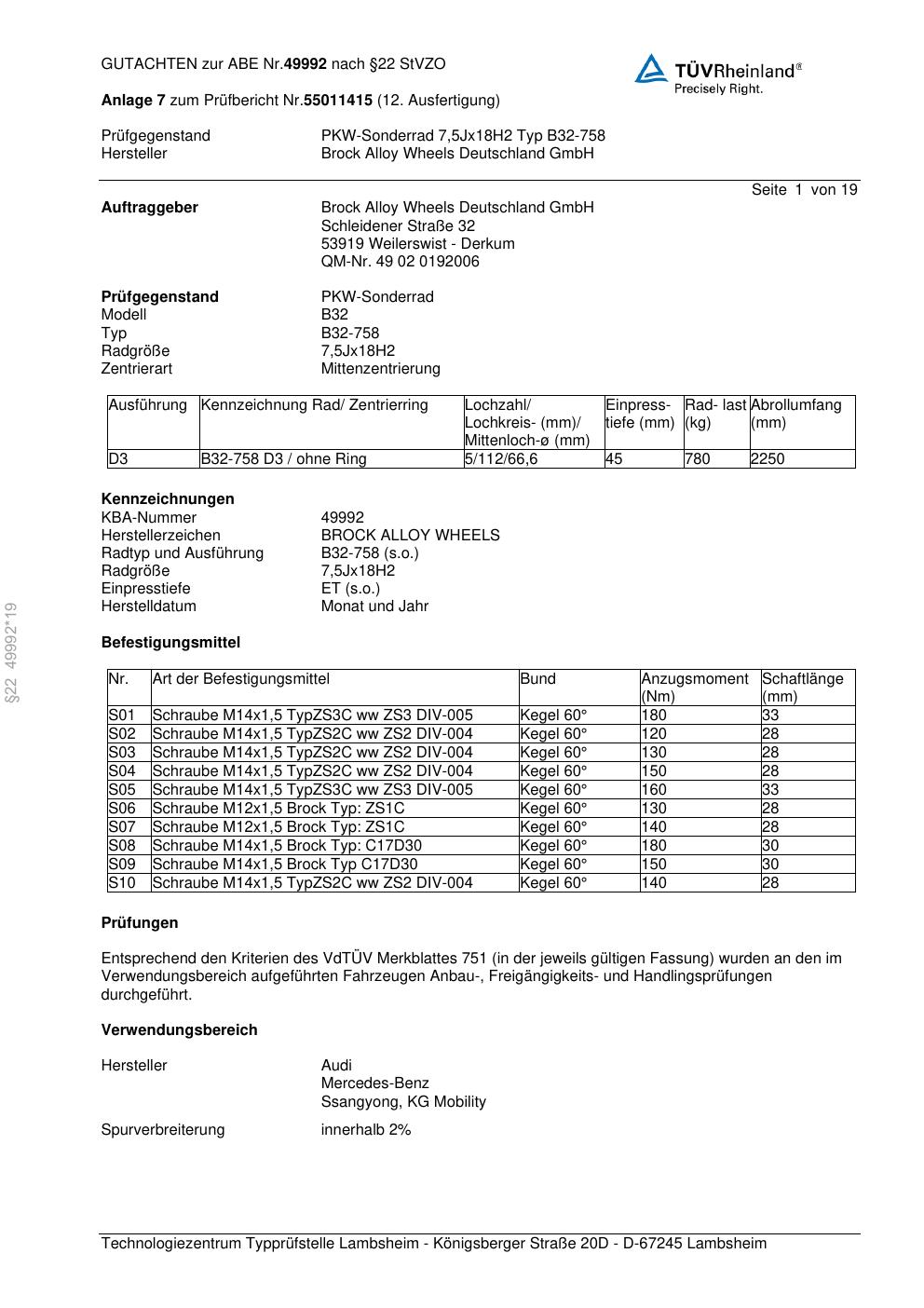 Dieses Gutachten (abe) bezieht sich auf die Alufelge Brock B32-758 in der Ausführung 7.5Jx18 ET 0, Mittenloch 0 mm (KBA 49992). Im PDF findest du typischerweise zulässige Reifengrößen, Auflagen/Anbauhinweise und – je nach Dokument – Hinweise zur Eintragung.