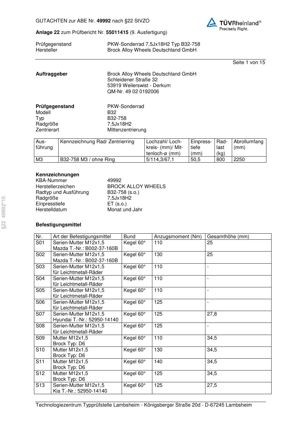 Dieses Gutachten (abe) bezieht sich auf die Alufelge Brock B32-758 in der Ausführung 7.5Jx18 ET 0, Mittenloch 0 mm (KBA 49992). Im PDF findest du typischerweise zulässige Reifengrößen, Auflagen/Anbauhinweise und – je nach Dokument – Hinweise zur Eintragung.