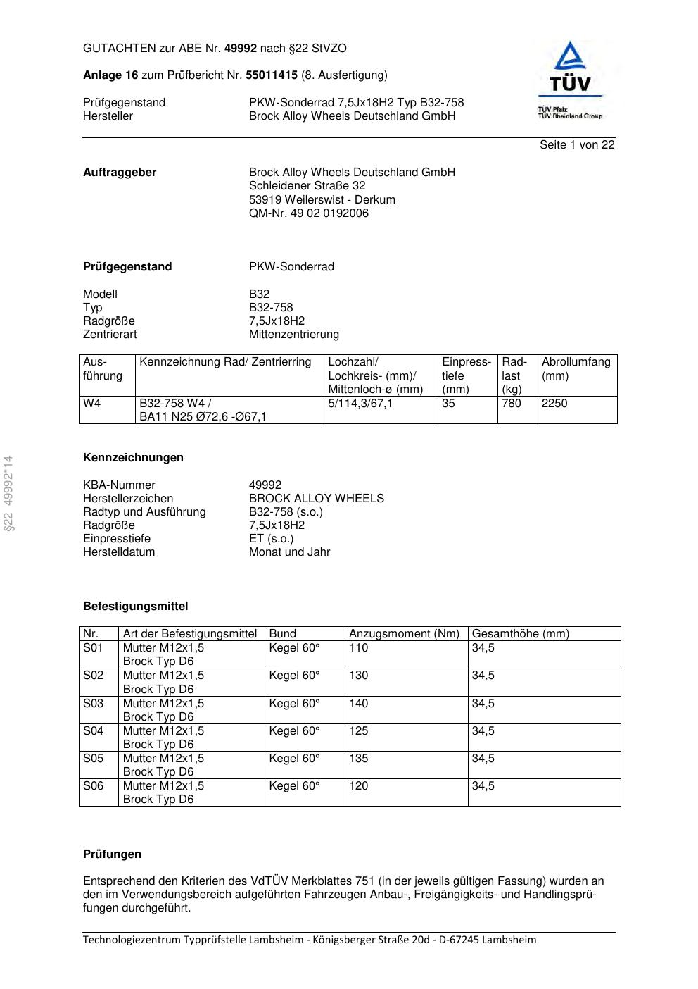 Felgengutachten / abe für Alufelgen Brock B32-758 (7.5Jx18 ET 0, Mittenloch 0 mm) mit KBA 49992 (Zertifikatsnummer 49992). Hier kostenlos als PDF herunterladen. Der Download-Link ist 24 Stunden gültig und kann bis zu zwei Mal verwendet werden.