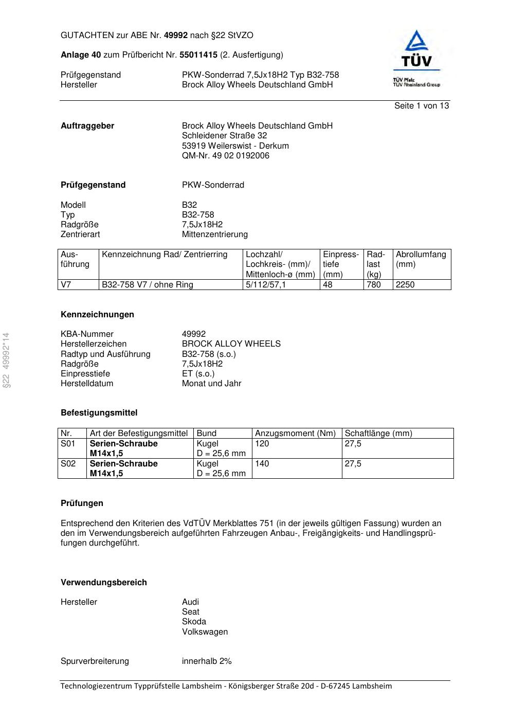Dieses Gutachten (abe) bezieht sich auf die Alufelge Brock B32-758 in der Ausführung 7.5Jx18 ET 0, Mittenloch 0 mm (KBA 49992). Im PDF findest du typischerweise zulässige Reifengrößen, Auflagen/Anbauhinweise und – je nach Dokument – Hinweise zur Eintragung.