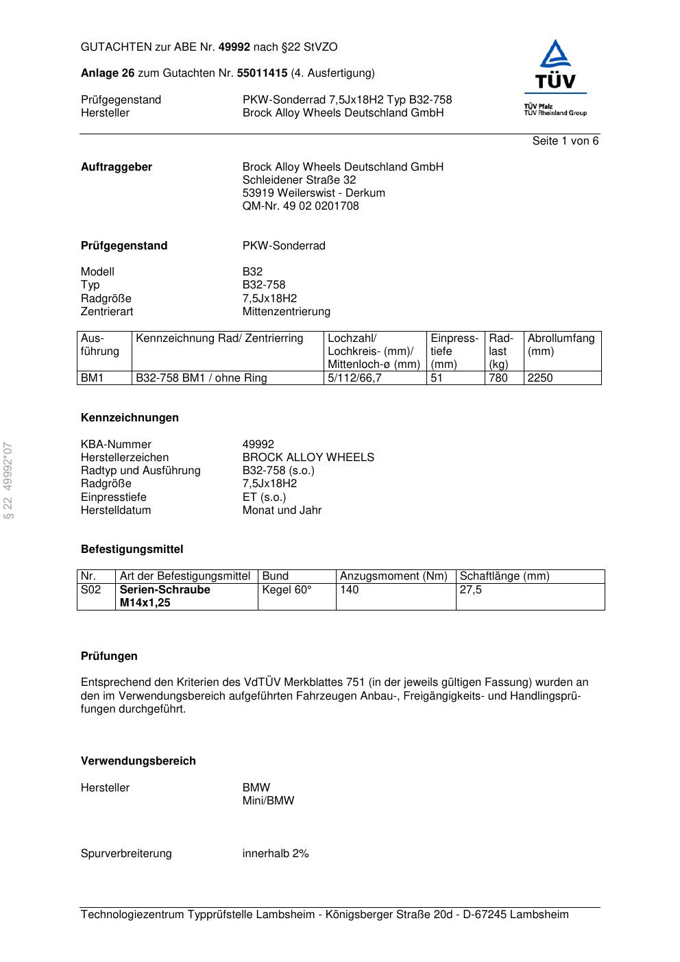Dieses Gutachten (abe) bezieht sich auf die Alufelge Brock B32-758 in der Ausführung 7.5Jx18 ET 0, Mittenloch 0 mm (KBA 49992). Im PDF findest du typischerweise zulässige Reifengrößen, Auflagen/Anbauhinweise und – je nach Dokument – Hinweise zur Eintragung.