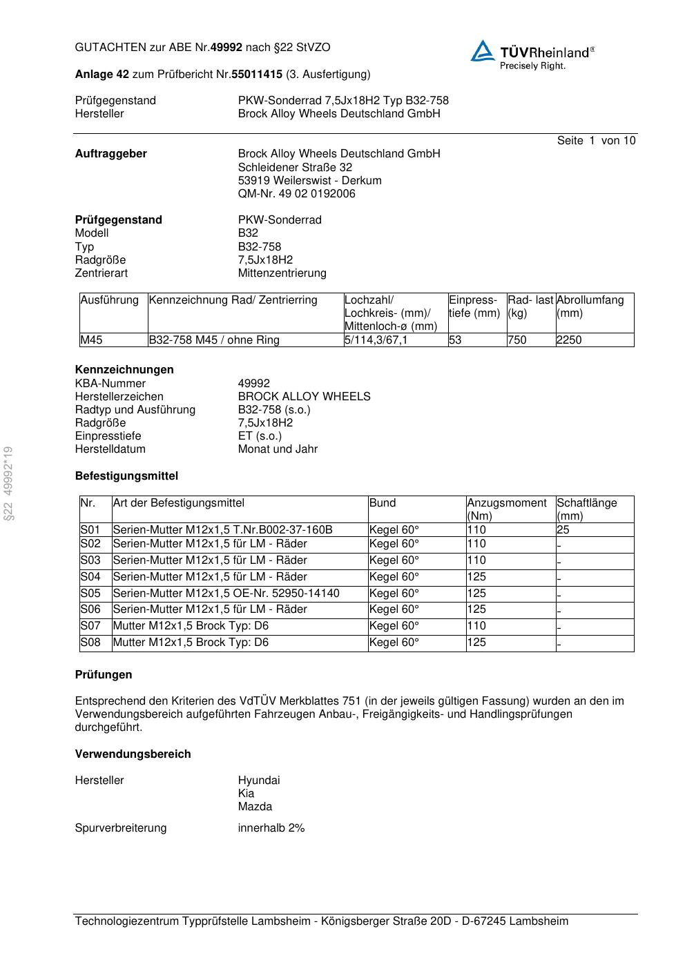 Dieses Gutachten (abe) bezieht sich auf die Alufelge Brock B32-758 in der Ausführung 7.5Jx18 ET 0, Mittenloch 0 mm (KBA 49992). Im PDF findest du typischerweise zulässige Reifengrößen, Auflagen/Anbauhinweise und – je nach Dokument – Hinweise zur Eintragung.