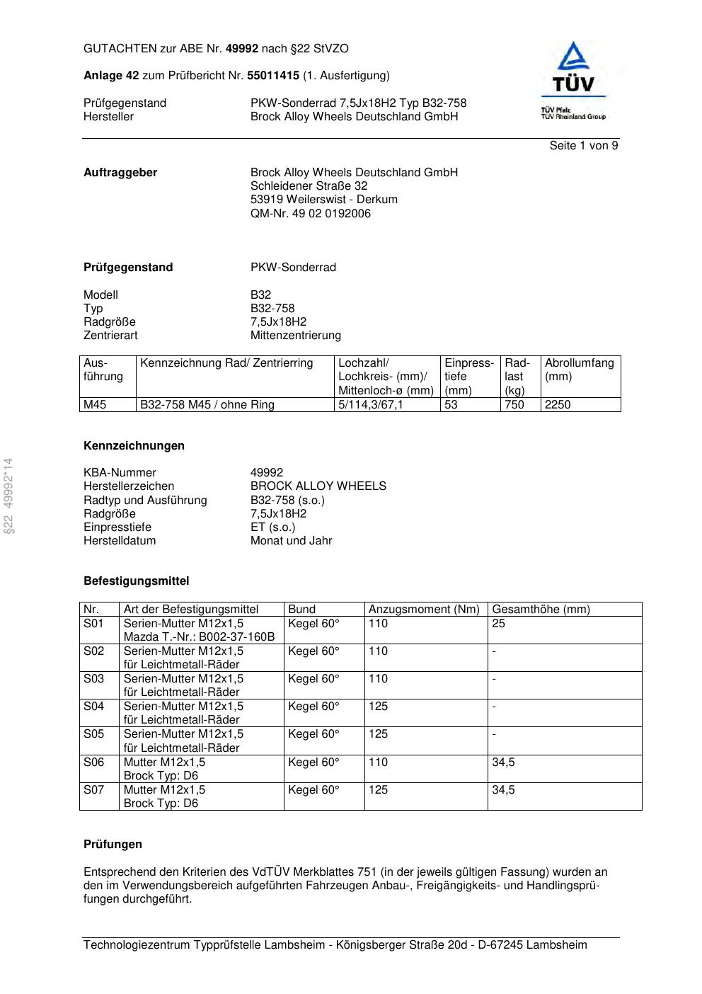 Dieses Gutachten (abe) bezieht sich auf die Alufelge Brock B32-758 in der Ausführung 7.5Jx18 ET 0, Mittenloch 0 mm (KBA 49992). Im PDF findest du typischerweise zulässige Reifengrößen, Auflagen/Anbauhinweise und – je nach Dokument – Hinweise zur Eintragung.