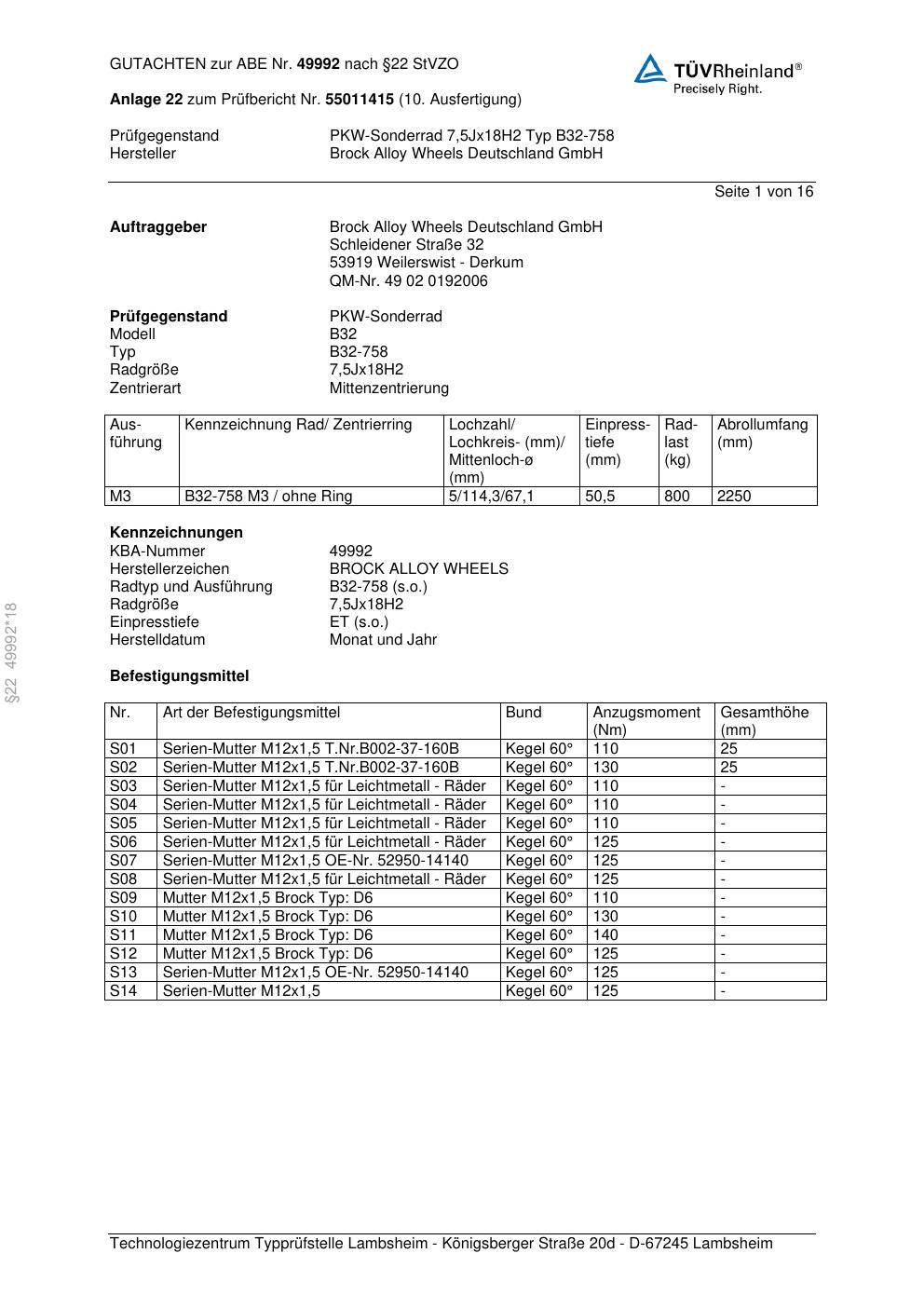 Felgengutachten / abe für Alufelgen Brock B32-758 (7.5Jx18 ET 0, Mittenloch 0 mm) mit KBA 49992 (Zertifikatsnummer 49992). Hier kostenlos als PDF herunterladen. Der Download-Link ist 24 Stunden gültig und kann bis zu zwei Mal verwendet werden.