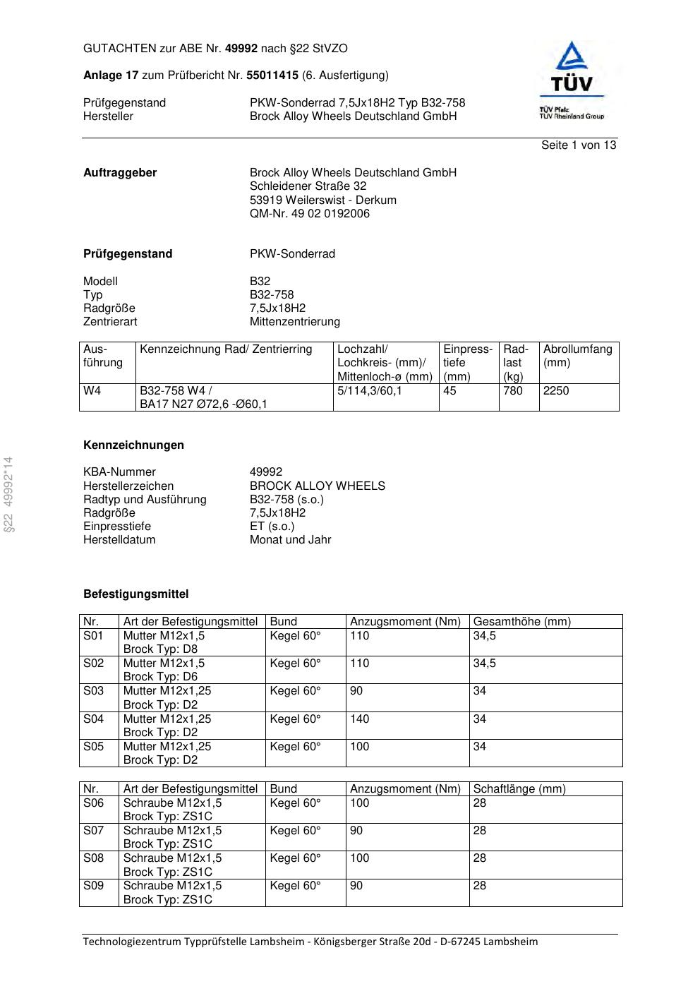 Dieses Gutachten (abe) bezieht sich auf die Alufelge Brock B32-758 in der Ausführung 7.5Jx18 ET 0, Mittenloch 0 mm (KBA 49992). Im PDF findest du typischerweise zulässige Reifengrößen, Auflagen/Anbauhinweise und – je nach Dokument – Hinweise zur Eintragung.