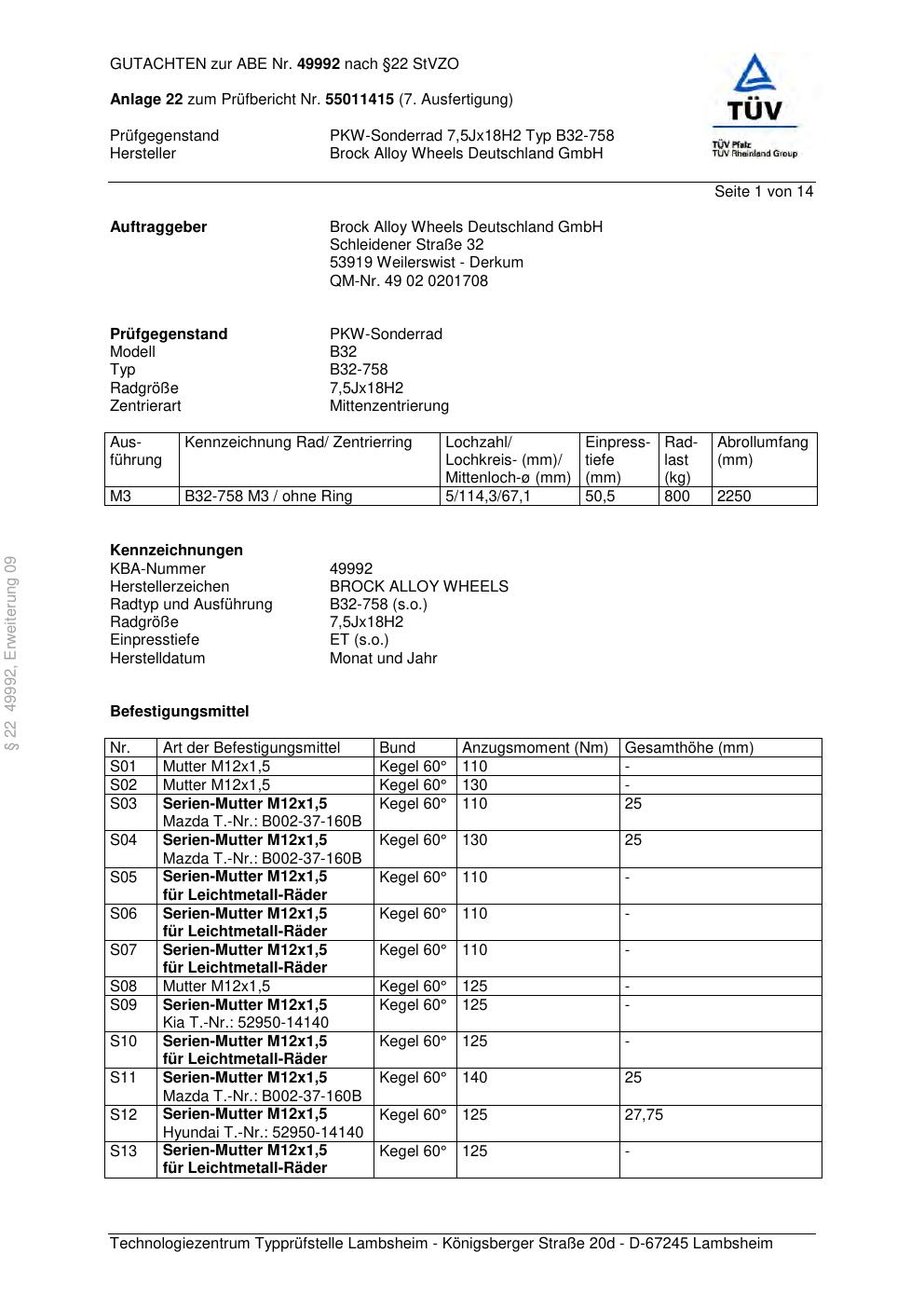 Dieses Gutachten (abe) bezieht sich auf die Alufelge Brock B32-758 in der Ausführung 7.5Jx18 ET 0, Mittenloch 0 mm (KBA 49992). Im PDF findest du typischerweise zulässige Reifengrößen, Auflagen/Anbauhinweise und – je nach Dokument – Hinweise zur Eintragung.