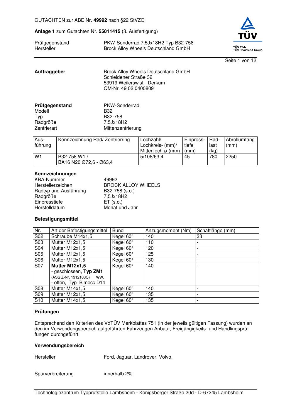 Dieses Gutachten (abe) bezieht sich auf die Alufelge Brock B32-758 in der Ausführung 7.5Jx18 ET 0, Mittenloch 0 mm (KBA 49992). Im PDF findest du typischerweise zulässige Reifengrößen, Auflagen/Anbauhinweise und – je nach Dokument – Hinweise zur Eintragung.