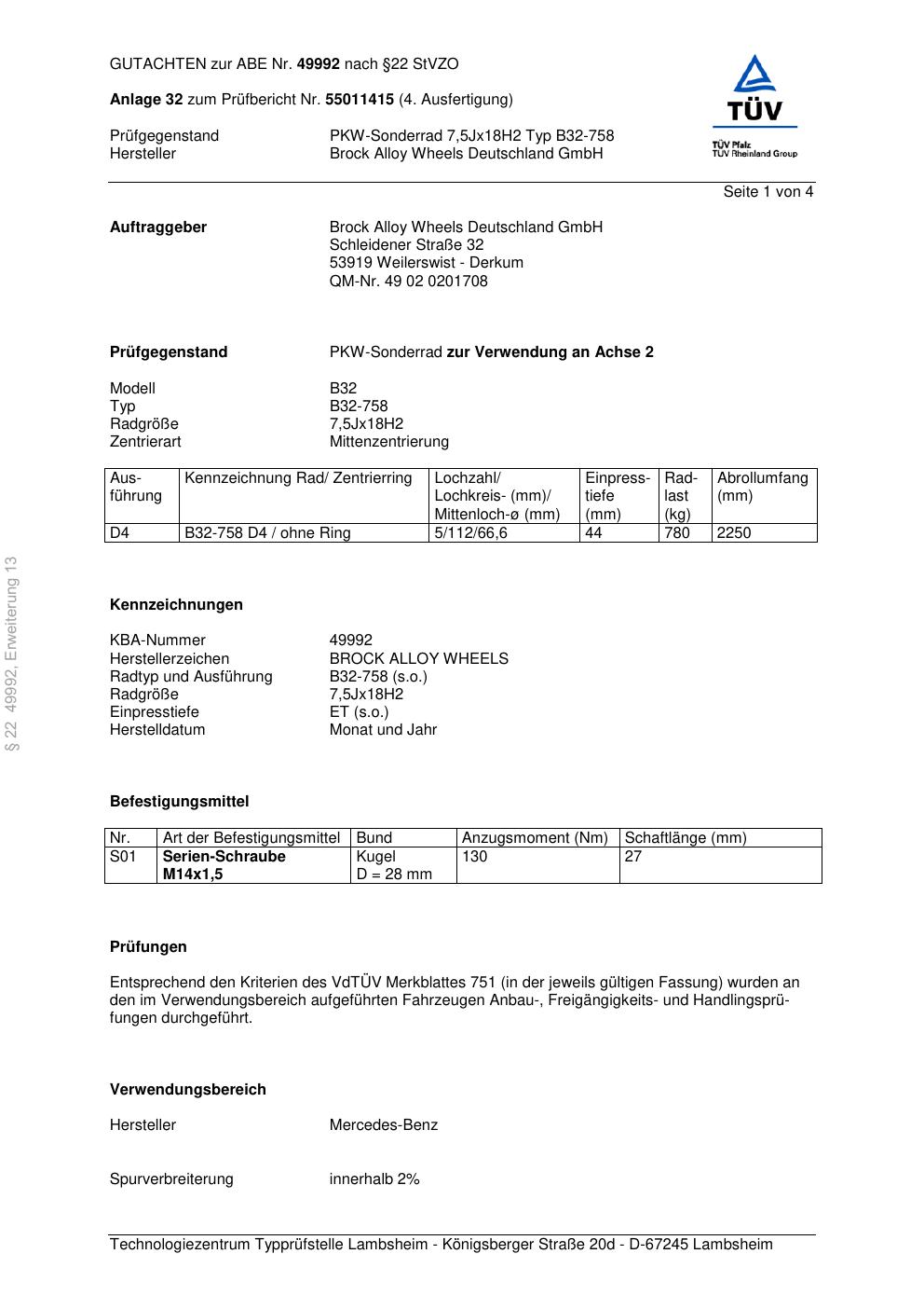 Dieses Gutachten (abe) bezieht sich auf die Alufelge Brock B32-758 in der Ausführung 7.5Jx18 ET 0, Mittenloch 0 mm (KBA 49992). Im PDF findest du typischerweise zulässige Reifengrößen, Auflagen/Anbauhinweise und – je nach Dokument – Hinweise zur Eintragung.