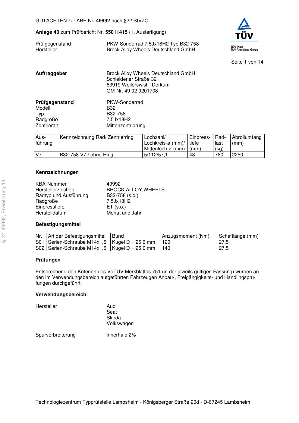Dieses Gutachten (abe) bezieht sich auf die Alufelge Brock B32-758 in der Ausführung 7.5Jx18 ET 0, Mittenloch 0 mm (KBA 49992). Im PDF findest du typischerweise zulässige Reifengrößen, Auflagen/Anbauhinweise und – je nach Dokument – Hinweise zur Eintragung.