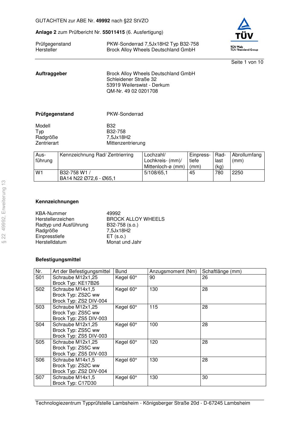 Felgengutachten / abe für Alufelgen Brock B32-758 (7.5Jx18 ET 0, Mittenloch 0 mm) mit KBA 49992 (Zertifikatsnummer 49992). Hier kostenlos als PDF herunterladen. Der Download-Link ist 24 Stunden gültig und kann bis zu zwei Mal verwendet werden.