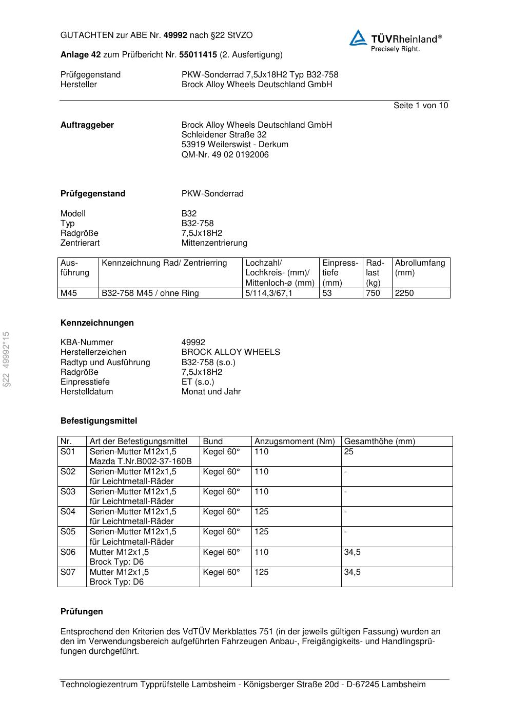 Dieses Gutachten (abe) bezieht sich auf die Alufelge Brock B32-758 in der Ausführung 7.5Jx18 ET 0, Mittenloch 0 mm (KBA 49992). Im PDF findest du typischerweise zulässige Reifengrößen, Auflagen/Anbauhinweise und – je nach Dokument – Hinweise zur Eintragung.
