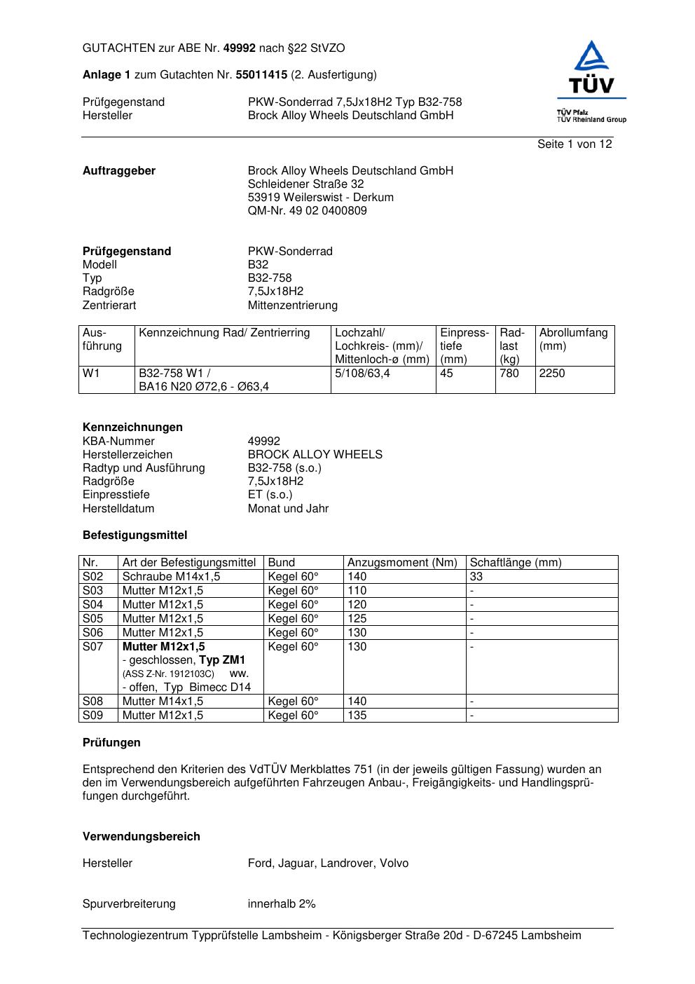 Dieses Gutachten (abe) bezieht sich auf die Alufelge Brock B32-758 in der Ausführung 7.5Jx18 ET 0, Mittenloch 0 mm (KBA 49992). Im PDF findest du typischerweise zulässige Reifengrößen, Auflagen/Anbauhinweise und – je nach Dokument – Hinweise zur Eintragung.