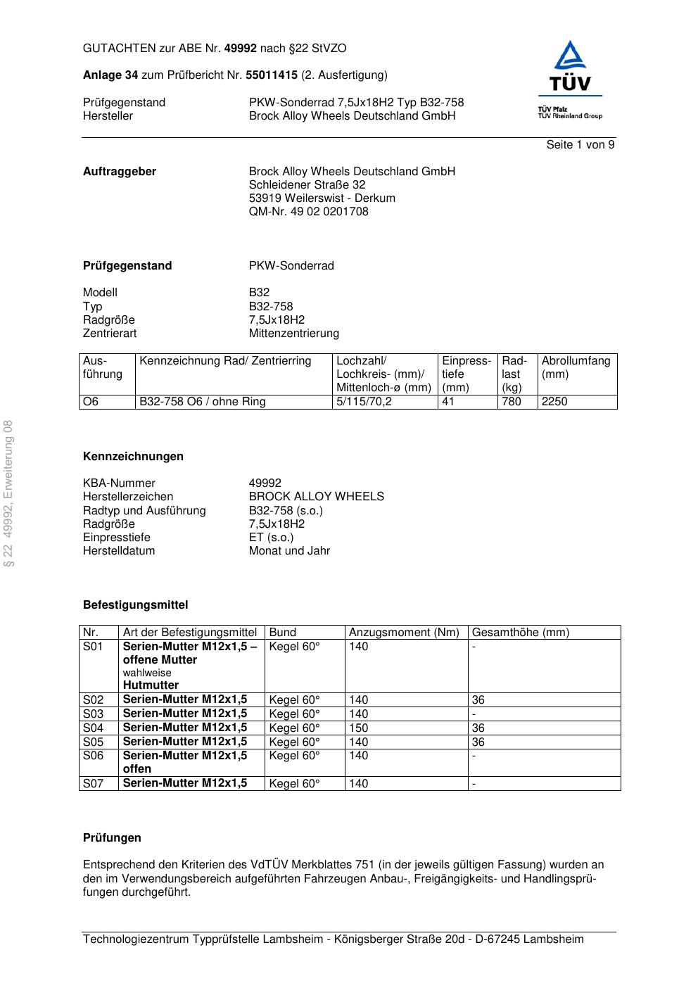 Dieses Gutachten (abe) bezieht sich auf die Alufelge Brock B32-758 in der Ausführung 7.5Jx18 ET 0, Mittenloch 0 mm (KBA 49992). Im PDF findest du typischerweise zulässige Reifengrößen, Auflagen/Anbauhinweise und – je nach Dokument – Hinweise zur Eintragung.