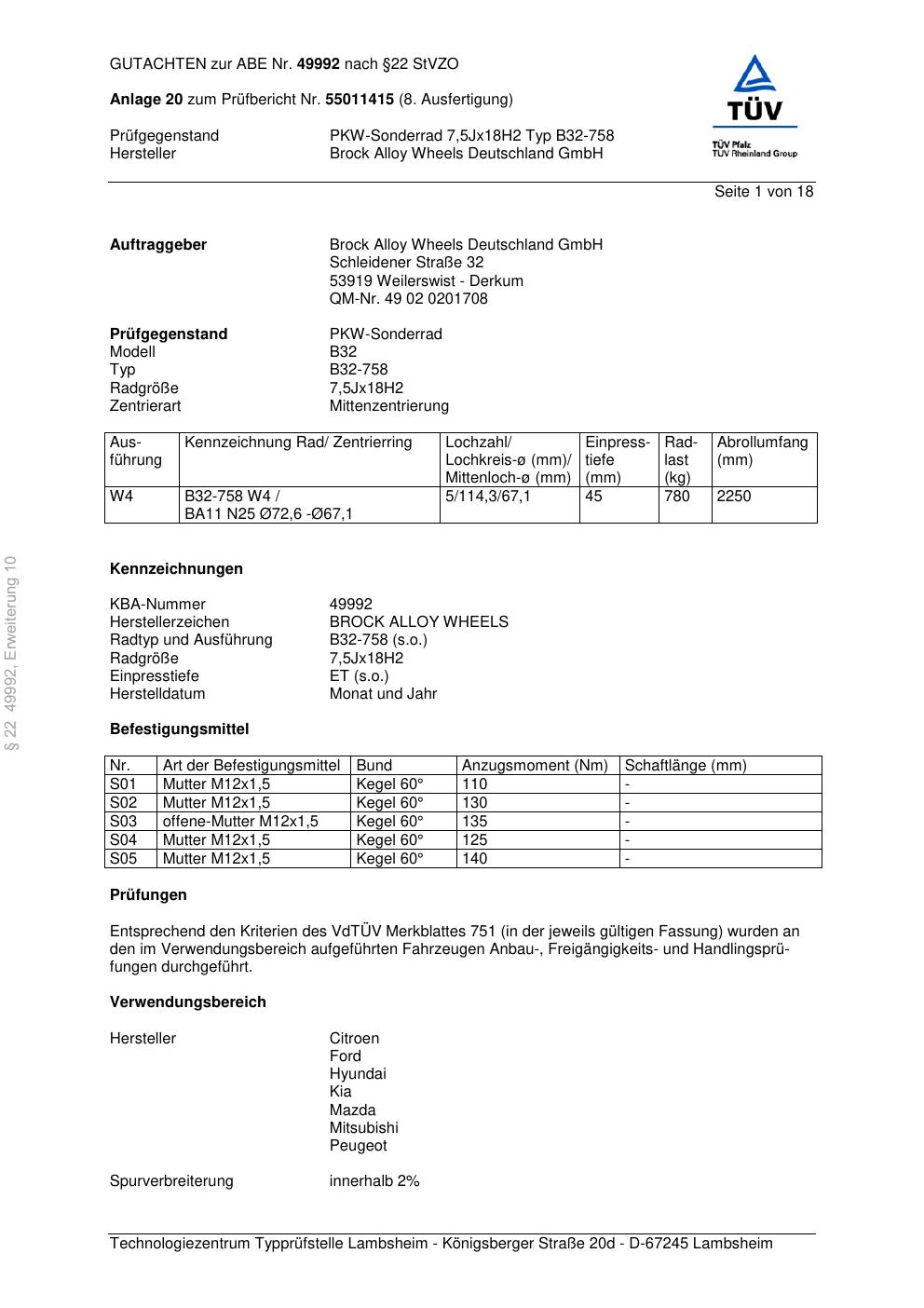 Dieses Gutachten (abe) bezieht sich auf die Alufelge Brock B32-758 in der Ausführung 7.5Jx18 ET 0, Mittenloch 0 mm (KBA 49992). Im PDF findest du typischerweise zulässige Reifengrößen, Auflagen/Anbauhinweise und – je nach Dokument – Hinweise zur Eintragung.