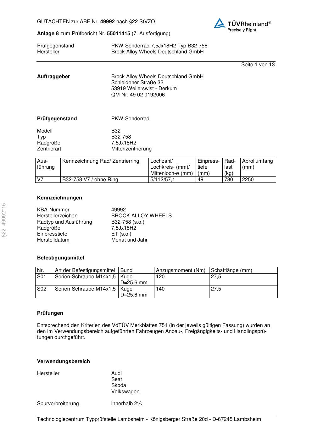 Dieses Gutachten (abe) bezieht sich auf die Alufelge Brock B32-758 in der Ausführung 7.5Jx18 ET 0, Mittenloch 0 mm (KBA 49992). Im PDF findest du typischerweise zulässige Reifengrößen, Auflagen/Anbauhinweise und – je nach Dokument – Hinweise zur Eintragung.