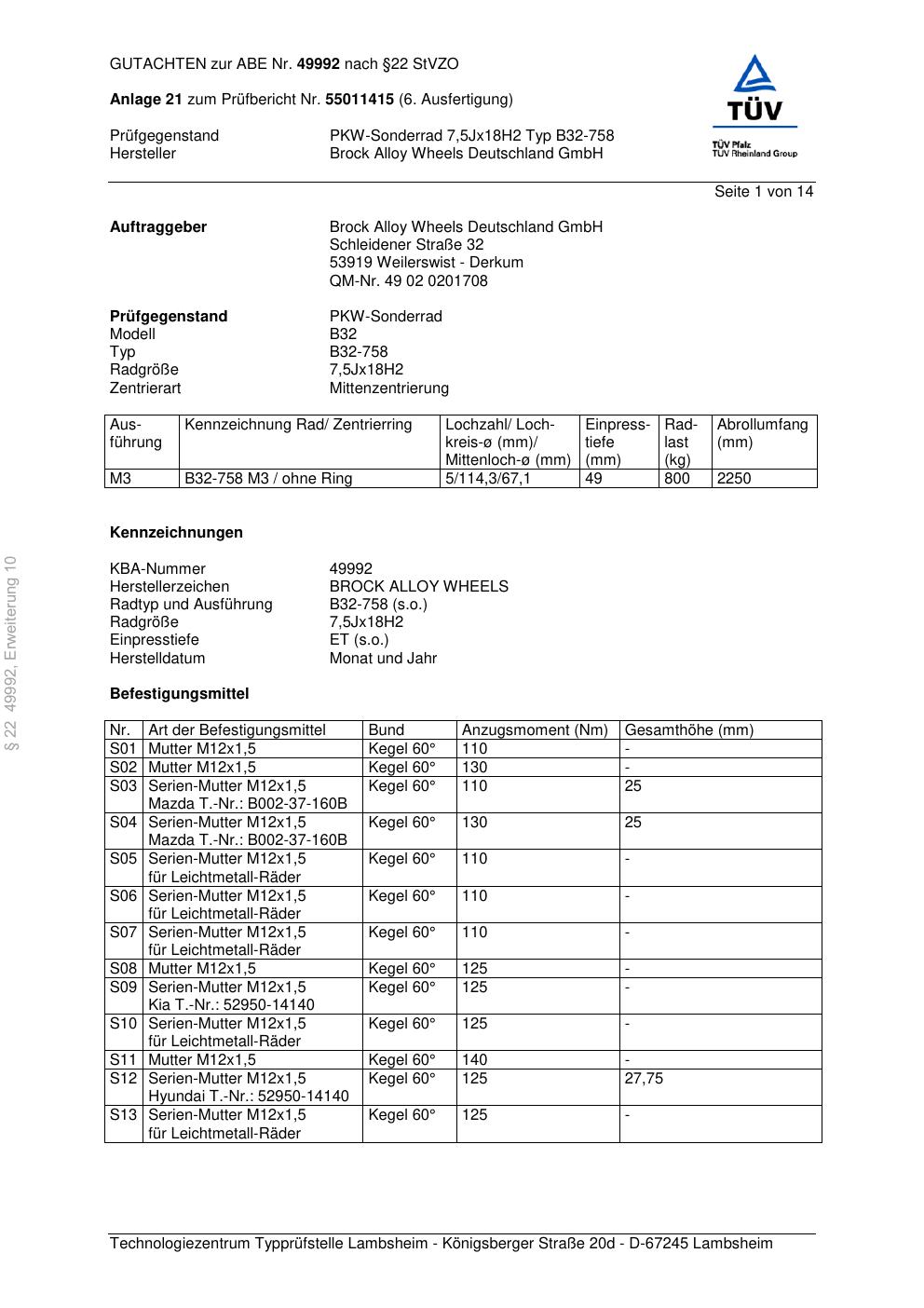 Felgengutachten / abe für Alufelgen Brock B32-758 (7.5Jx18 ET 0, Mittenloch 0 mm) mit KBA 49992 (Zertifikatsnummer 49992). Hier kostenlos als PDF herunterladen. Der Download-Link ist 24 Stunden gültig und kann bis zu zwei Mal verwendet werden.