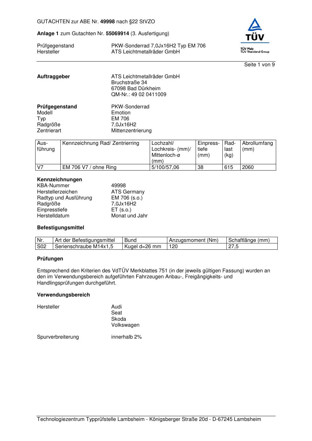 Dieses Gutachten (abe) bezieht sich auf die Alufelge ATS EM 706 in der Ausführung 7Jx16 ET 0, Mittenloch 0 mm (KBA 49998). Im PDF findest du typischerweise zulässige Reifengrößen, Auflagen/Anbauhinweise und – je nach Dokument – Hinweise zur Eintragung.