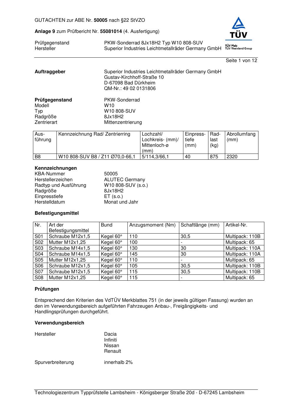 Dieses Gutachten (abe) bezieht sich auf die Alufelge ALUTEC W10 808-SU V in der Ausführung 8Jx18 ET 0, Mittenloch 0 mm (KBA 50005). Im PDF findest du typischerweise zulässige Reifengrößen, Auflagen/Anbauhinweise und – je nach Dokument – Hinweise zur Eintragung.