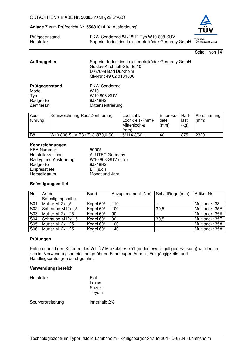 Felgengutachten / abe für Alufelgen ALUTEC W10 808-SU V (8Jx18 ET 0, Mittenloch 0 mm) mit KBA 50005 (Zertifikatsnummer 50005). Hier kostenlos als PDF herunterladen. Der Download-Link ist 24 Stunden gültig und kann bis zu zwei Mal verwendet werden.