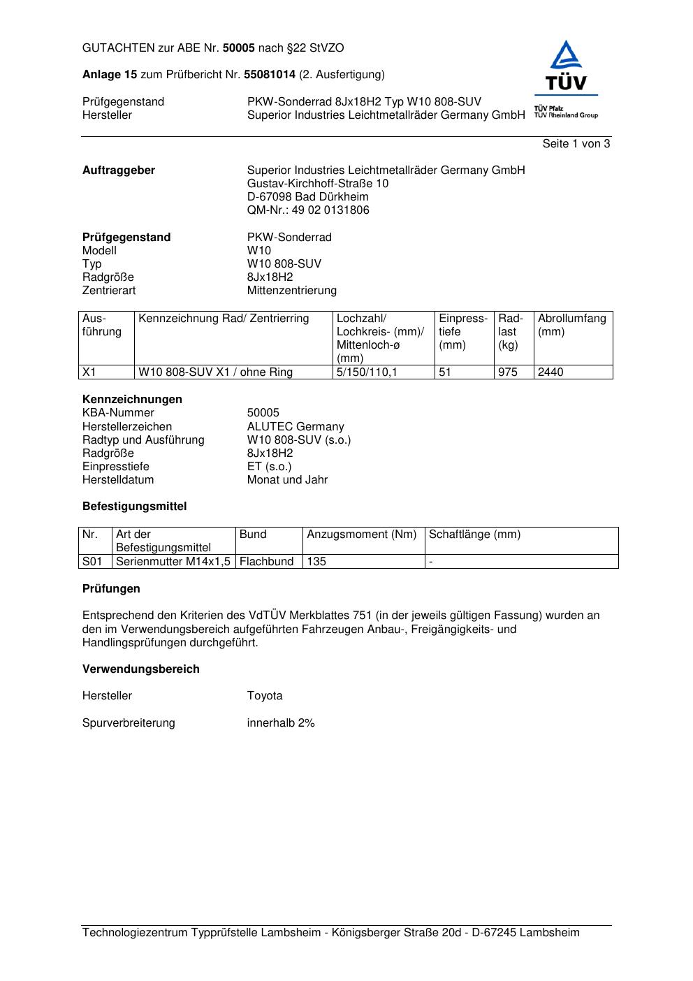 Dieses Gutachten (abe) bezieht sich auf die Alufelge ALUTEC W10 808-SU V in der Ausführung 8Jx18 ET 0, Mittenloch 0 mm (KBA 50005). Im PDF findest du typischerweise zulässige Reifengrößen, Auflagen/Anbauhinweise und – je nach Dokument – Hinweise zur Eintragung.
