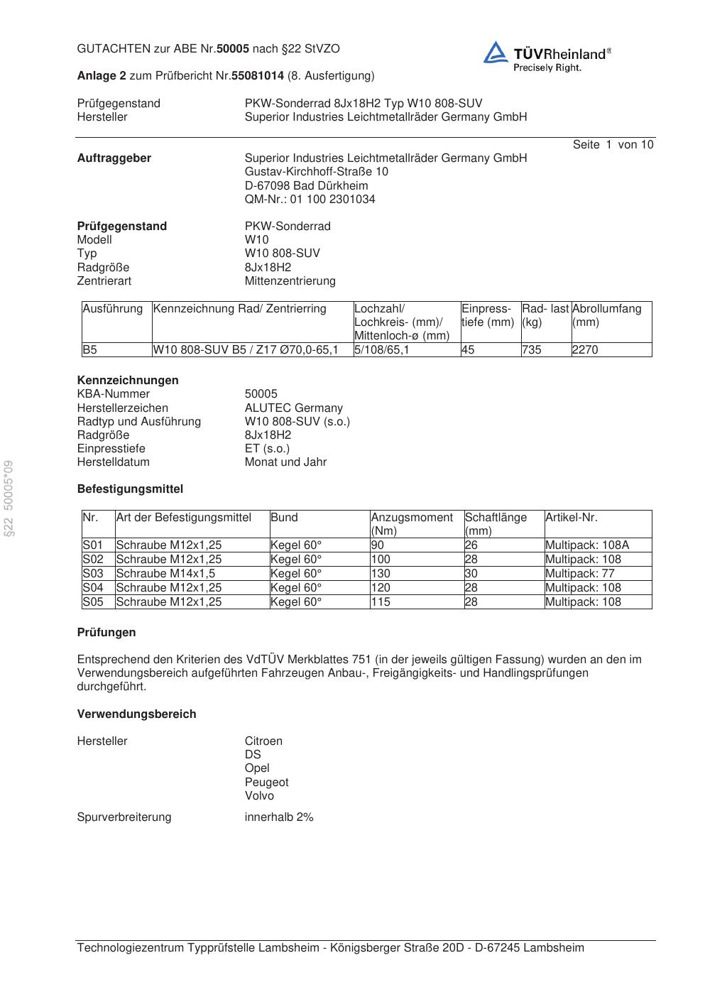 Dieses Gutachten (abe) bezieht sich auf die Alufelge ALUTEC W10 808-SUV in der Ausführung 8Jx18 ET 0, Mittenloch 0 mm (KBA 50005). Im PDF findest du typischerweise zulässige Reifengrößen, Auflagen/Anbauhinweise und – je nach Dokument – Hinweise zur Eintragung.