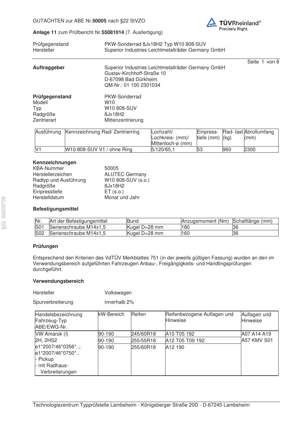 Dieses Gutachten (abe) bezieht sich auf die Alufelge ALUTEC W10 808-SUV in der Ausführung 8Jx18 ET 0, Mittenloch 0 mm (KBA 50005). Im PDF findest du typischerweise zulässige Reifengrößen, Auflagen/Anbauhinweise und – je nach Dokument – Hinweise zur Eintragung.