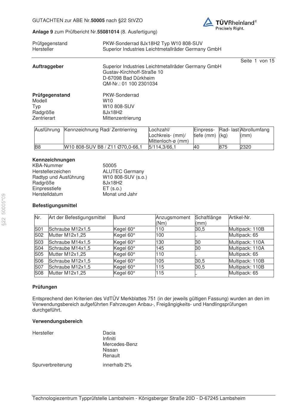 Dieses Gutachten (abe) bezieht sich auf die Alufelge ALUTEC W10 808-SUV in der Ausführung 8Jx18 ET 0, Mittenloch 0 mm (KBA 50005). Im PDF findest du typischerweise zulässige Reifengrößen, Auflagen/Anbauhinweise und – je nach Dokument – Hinweise zur Eintragung.