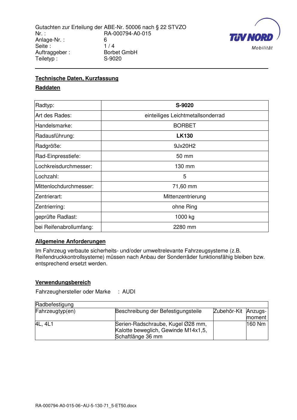 Dieses Gutachten (abe) bezieht sich auf die Alufelge brand-borbet S-9020 in der Ausführung 9Jx2 ET 0, Mittenloch 0 mm (KBA 50006). Im PDF findest du typischerweise zulässige Reifengrößen, Auflagen/Anbauhinweise und – je nach Dokument – Hinweise zur Eintragung.