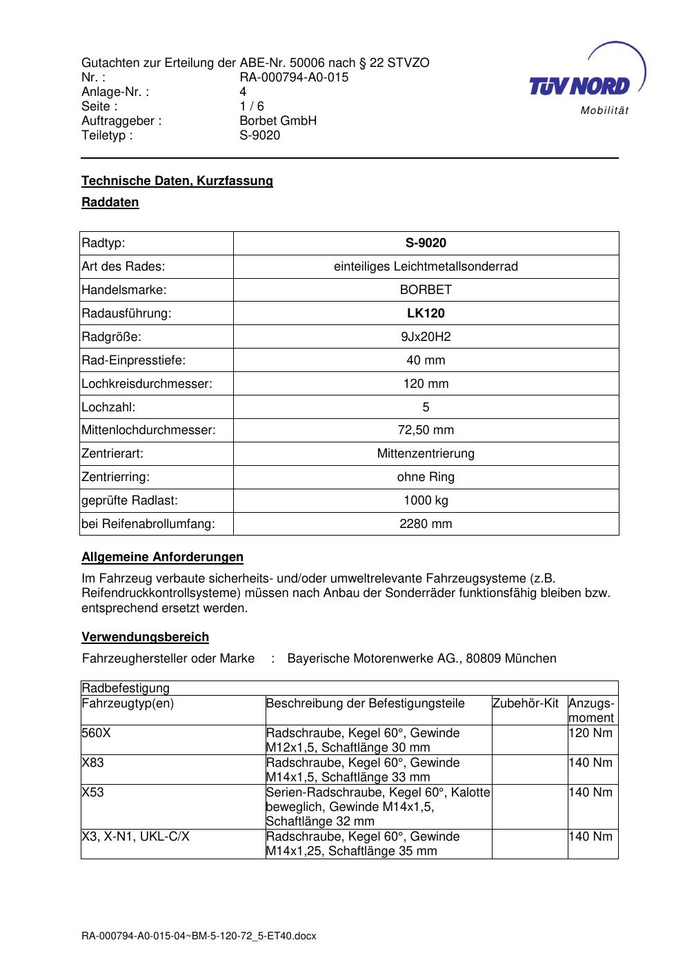 Dieses Gutachten (abe) bezieht sich auf die Alufelge brand-borbet S-9020 in der Ausführung 9Jx2 ET 0, Mittenloch 0 mm (KBA 50006). Im PDF findest du typischerweise zulässige Reifengrößen, Auflagen/Anbauhinweise und – je nach Dokument – Hinweise zur Eintragung.