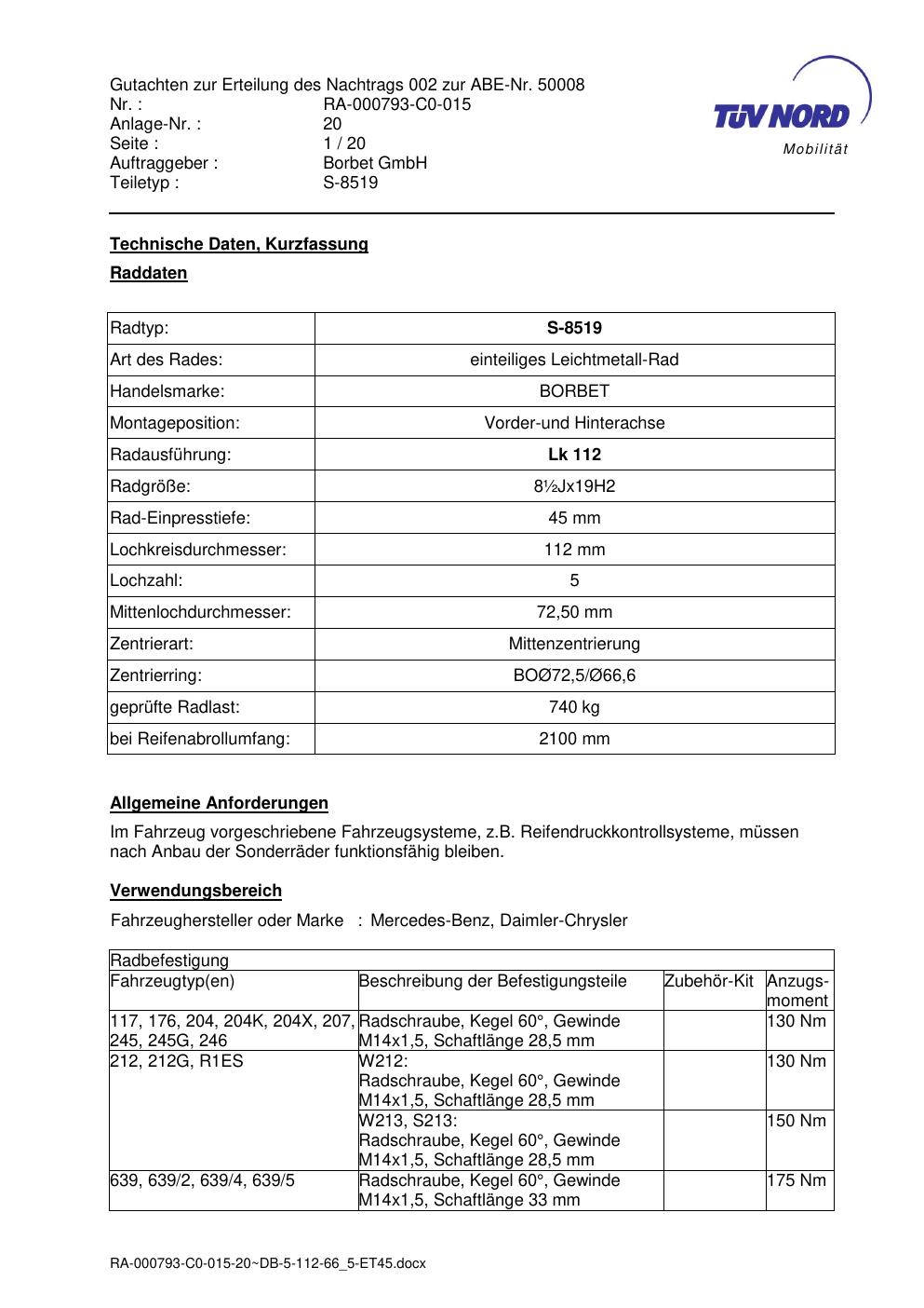 Dieses Gutachten (abe) bezieht sich auf die Alufelge brand-borbet S-8519 in der Ausführung ET 0, Mittenloch 0 mm (KBA 50008). Im PDF findest du typischerweise zulässige Reifengrößen, Auflagen/Anbauhinweise und – je nach Dokument – Hinweise zur Eintragung.