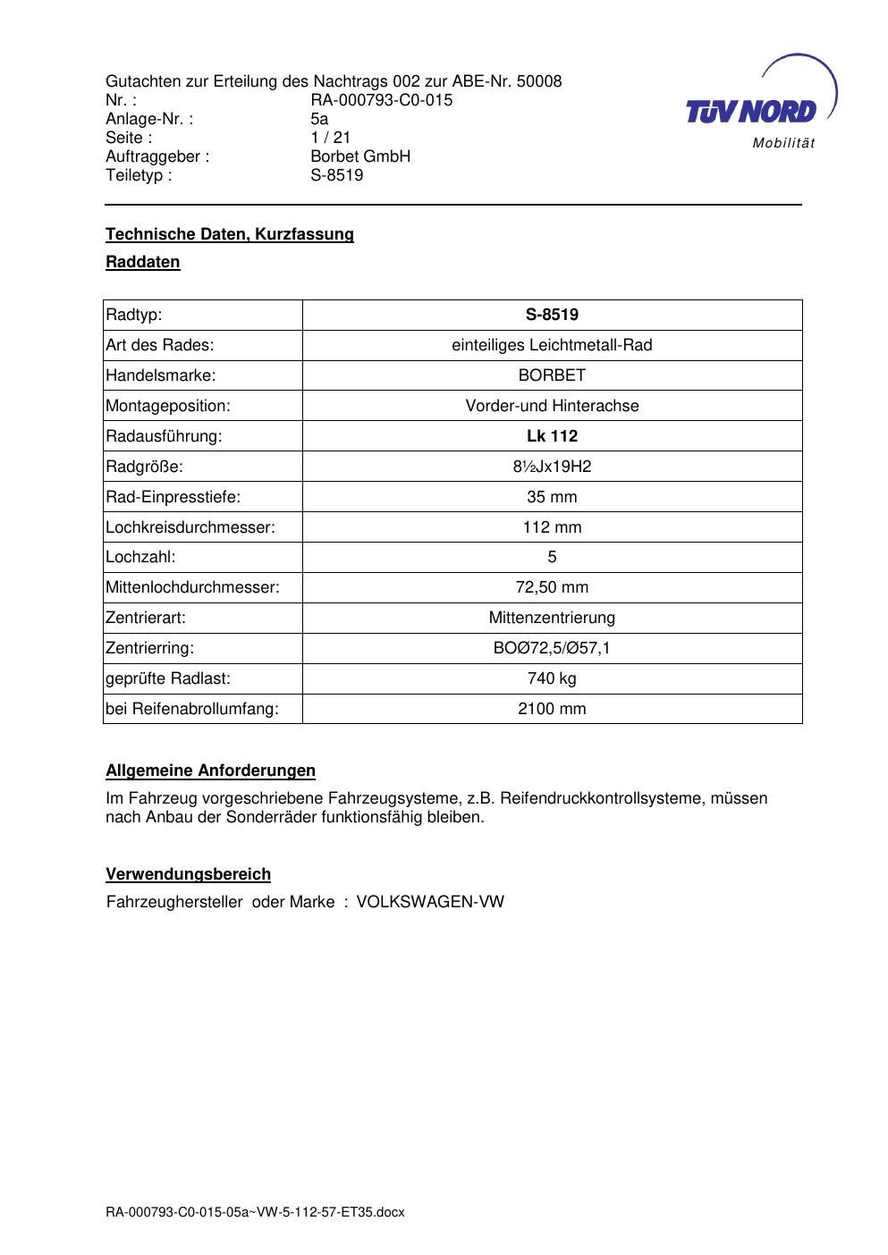 Dieses Gutachten (abe) bezieht sich auf die Alufelge brand-borbet S-8519 in der Ausführung ET 0, Mittenloch 0 mm (KBA 50008). Im PDF findest du typischerweise zulässige Reifengrößen, Auflagen/Anbauhinweise und – je nach Dokument – Hinweise zur Eintragung.