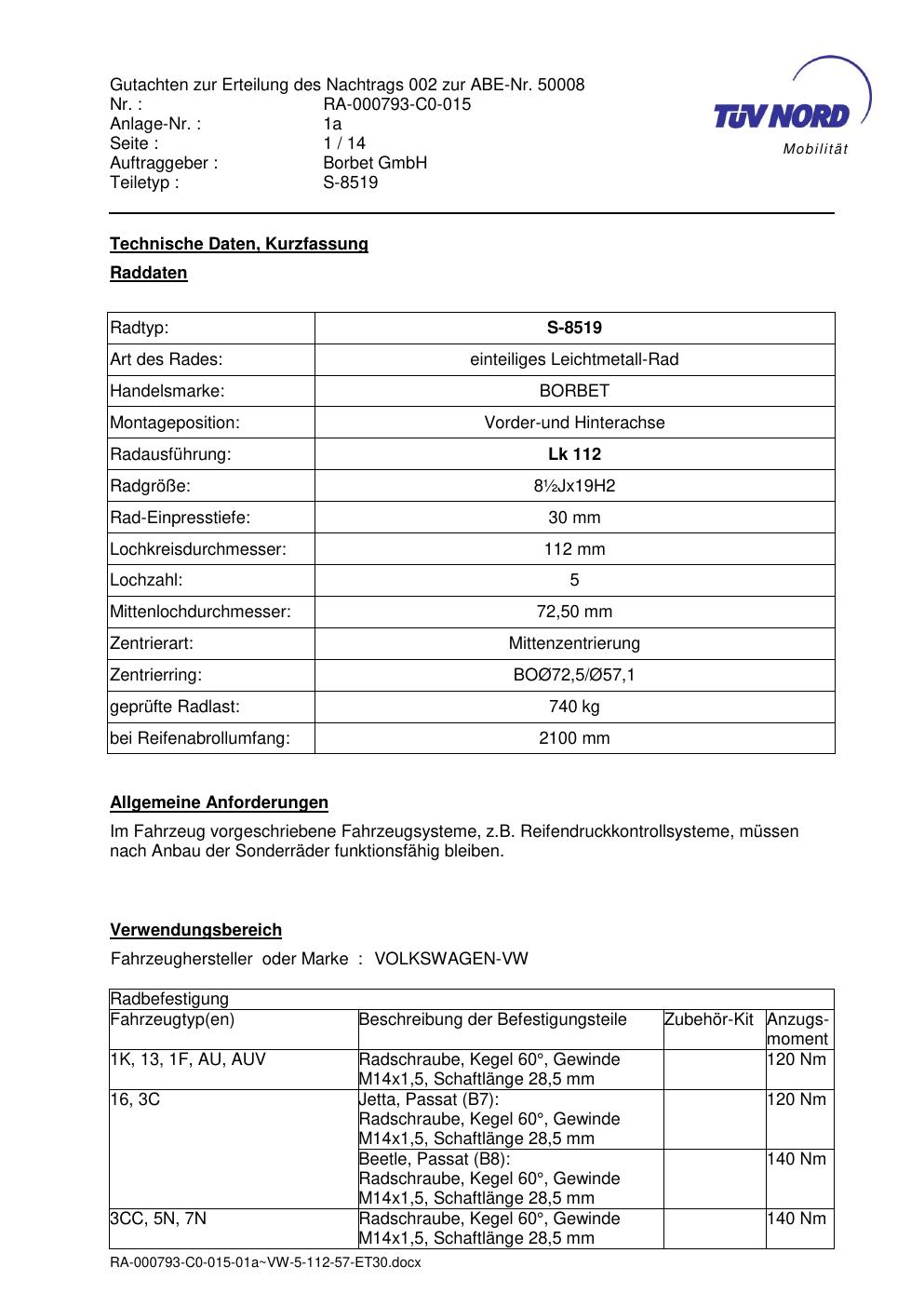 Felgengutachten / abe für Alufelgen brand-borbet S-8519 (ET 0, Mittenloch 0 mm) mit KBA 50008 (Zertifikatsnummer 50008). Hier kostenlos als PDF herunterladen. Der Download-Link ist 24 Stunden gültig und kann bis zu zwei Mal verwendet werden.