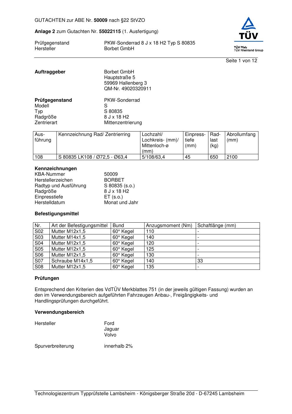 Dieses Gutachten (abe) bezieht sich auf die Alufelge Borbet S 8083 5 in der Ausführung 8Jx18 ET 0, Mittenloch 0 mm (KBA 50009). Im PDF findest du typischerweise zulässige Reifengrößen, Auflagen/Anbauhinweise und – je nach Dokument – Hinweise zur Eintragung.