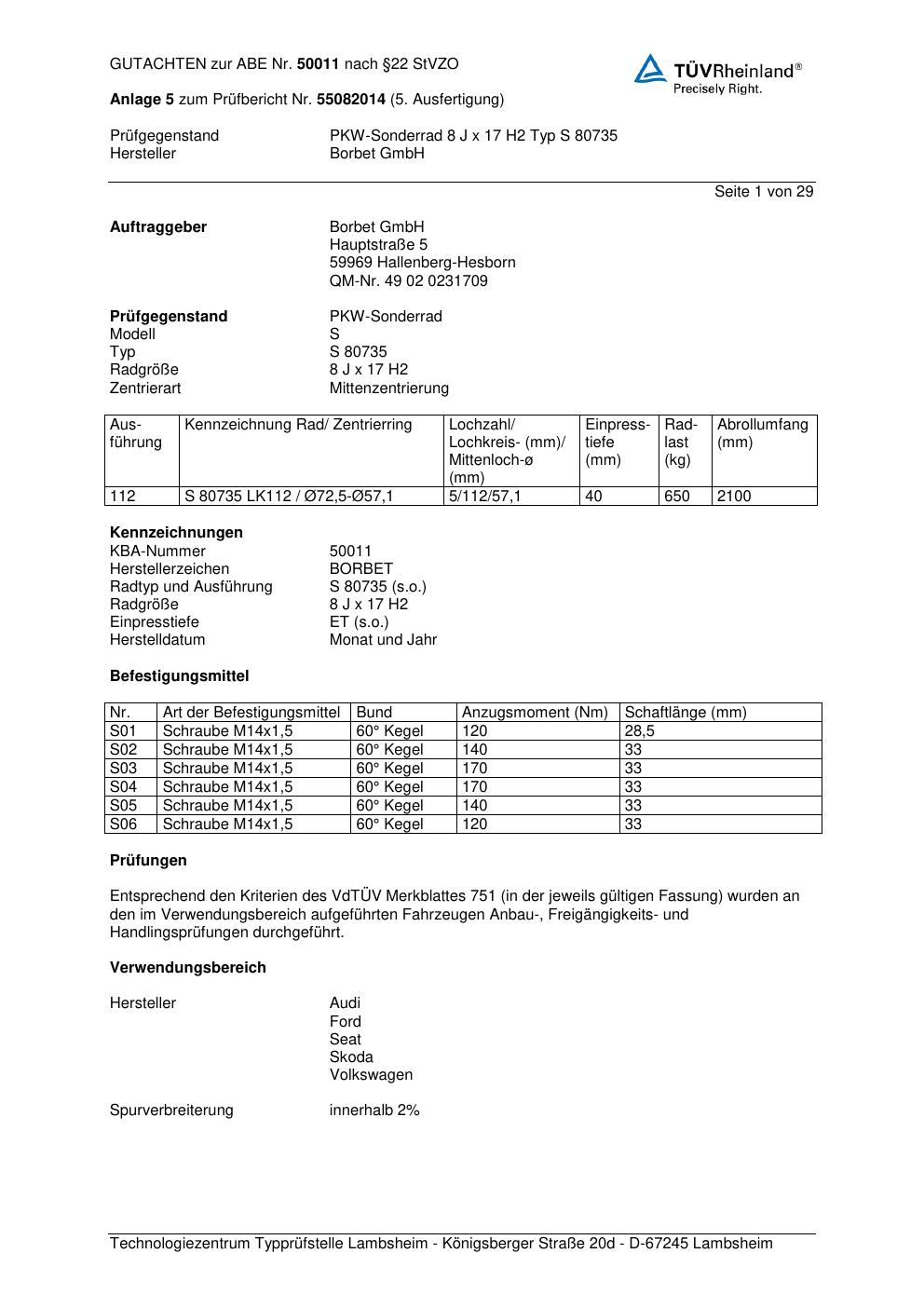 Dieses Gutachten (abe) bezieht sich auf die Alufelge Borbet S 8073 5 in der Ausführung 8Jx17 ET 0, Mittenloch 0 mm (KBA 50011). Im PDF findest du typischerweise zulässige Reifengrößen, Auflagen/Anbauhinweise und – je nach Dokument – Hinweise zur Eintragung.