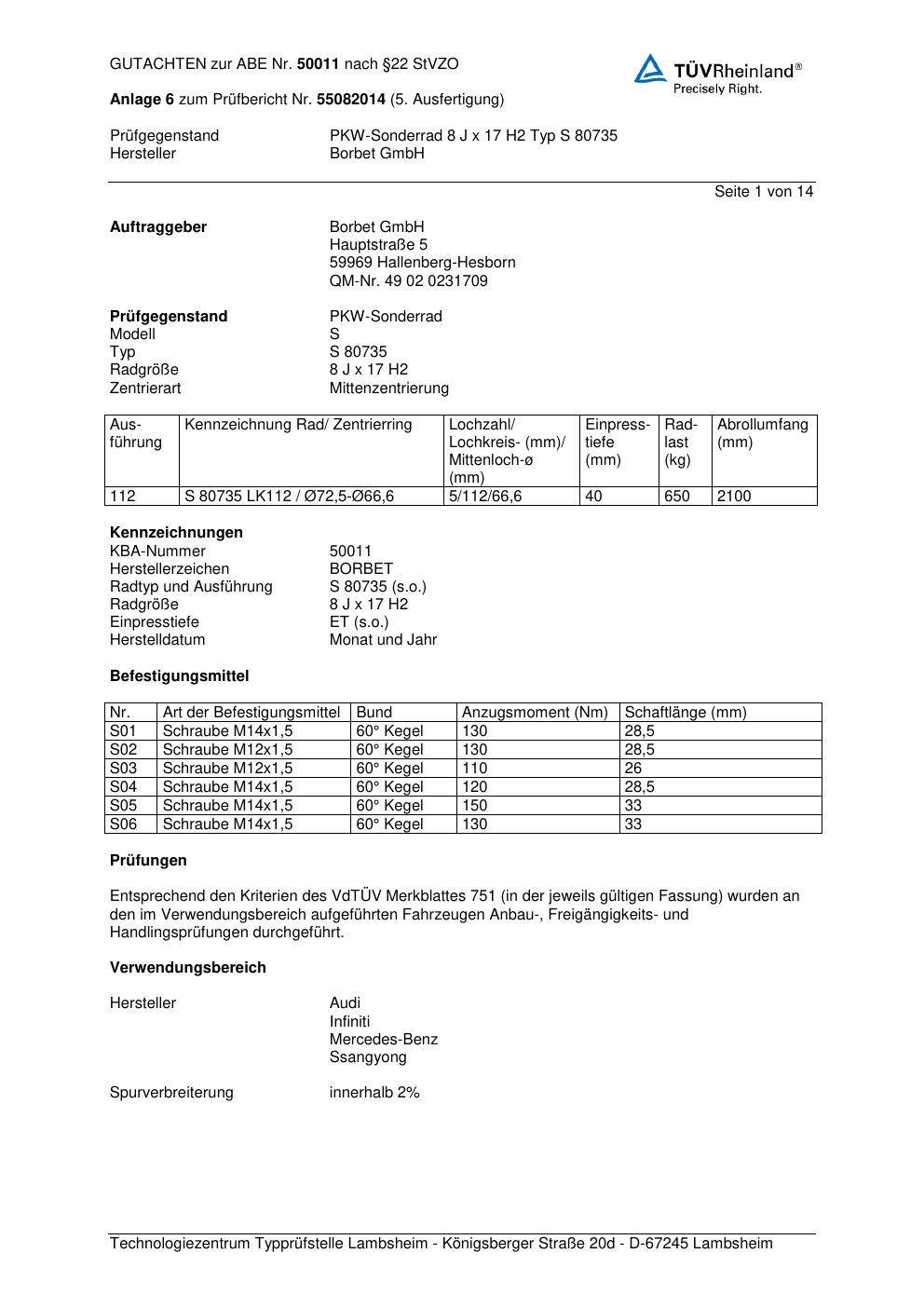 Dieses Gutachten (abe) bezieht sich auf die Alufelge Borbet S 8073 5 in der Ausführung 8Jx17 ET 0, Mittenloch 0 mm (KBA 50011). Im PDF findest du typischerweise zulässige Reifengrößen, Auflagen/Anbauhinweise und – je nach Dokument – Hinweise zur Eintragung.