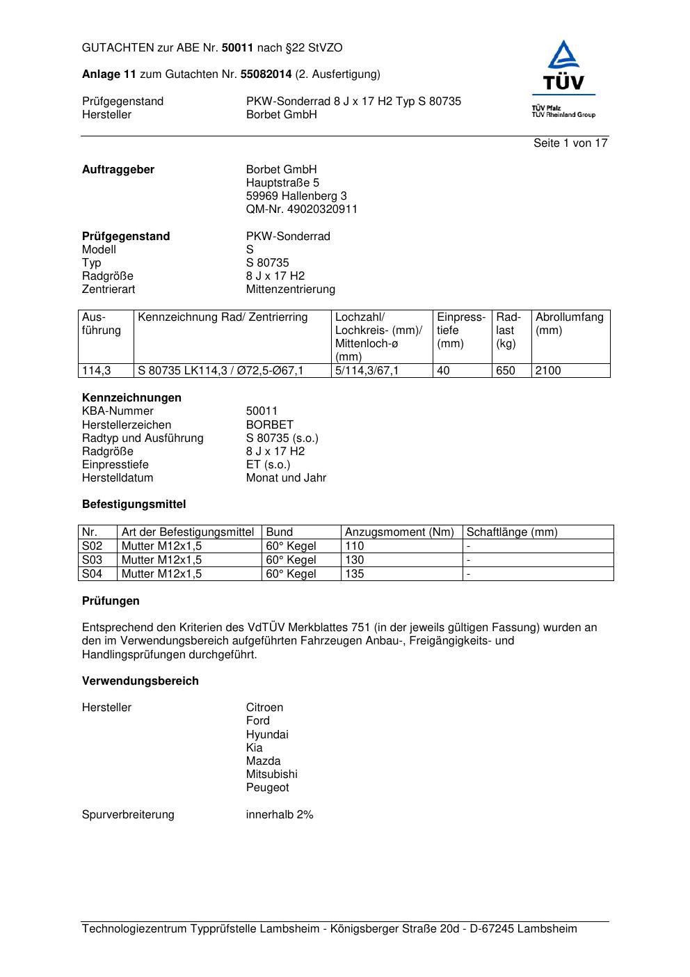 Dieses Gutachten (abe) bezieht sich auf die Alufelge Borbet S 8073 5 in der Ausführung 8Jx17 ET 0, Mittenloch 0 mm (KBA 50011). Im PDF findest du typischerweise zulässige Reifengrößen, Auflagen/Anbauhinweise und – je nach Dokument – Hinweise zur Eintragung.
