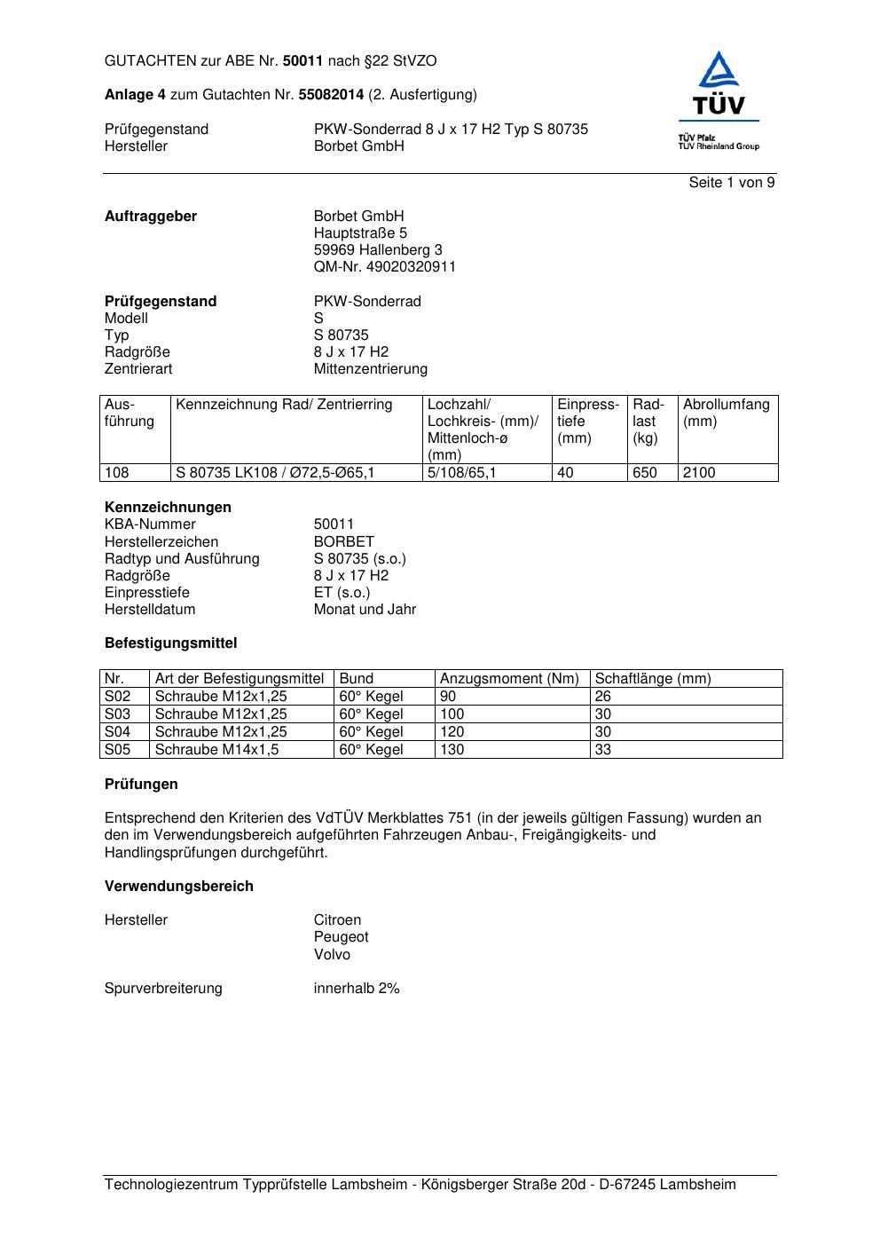 Dieses Gutachten (abe) bezieht sich auf die Alufelge Borbet S 8073 5 in der Ausführung 8Jx17 ET 0, Mittenloch 0 mm (KBA 50011). Im PDF findest du typischerweise zulässige Reifengrößen, Auflagen/Anbauhinweise und – je nach Dokument – Hinweise zur Eintragung.