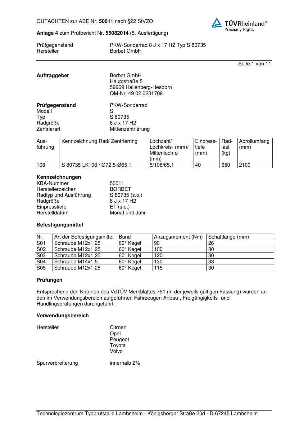 Dieses Gutachten (abe) bezieht sich auf die Alufelge Borbet S 8073 5 in der Ausführung 8Jx17 ET 0, Mittenloch 0 mm (KBA 50011). Im PDF findest du typischerweise zulässige Reifengrößen, Auflagen/Anbauhinweise und – je nach Dokument – Hinweise zur Eintragung.