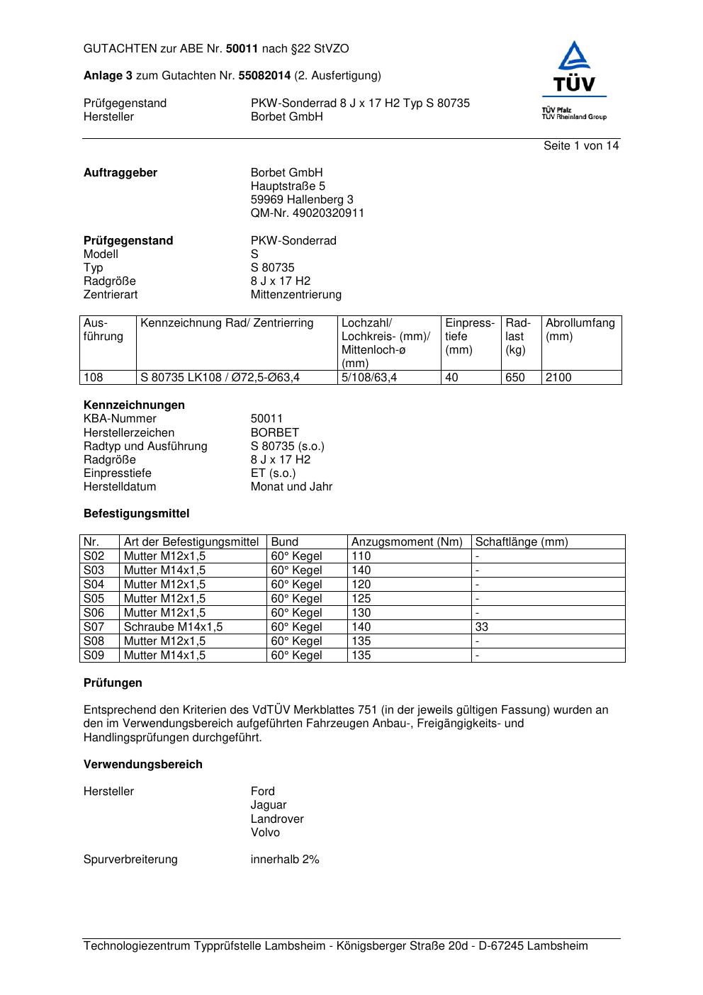 Dieses Gutachten (abe) bezieht sich auf die Alufelge Borbet S 8073 5 in der Ausführung 8Jx17 ET 0, Mittenloch 0 mm (KBA 50011). Im PDF findest du typischerweise zulässige Reifengrößen, Auflagen/Anbauhinweise und – je nach Dokument – Hinweise zur Eintragung.