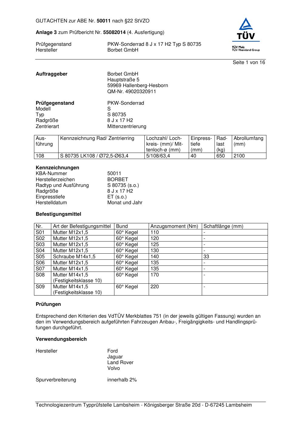 Dieses Gutachten (abe) bezieht sich auf die Alufelge Borbet S 8073 5 in der Ausführung 8Jx17 ET 0, Mittenloch 0 mm (KBA 50011). Im PDF findest du typischerweise zulässige Reifengrößen, Auflagen/Anbauhinweise und – je nach Dokument – Hinweise zur Eintragung.