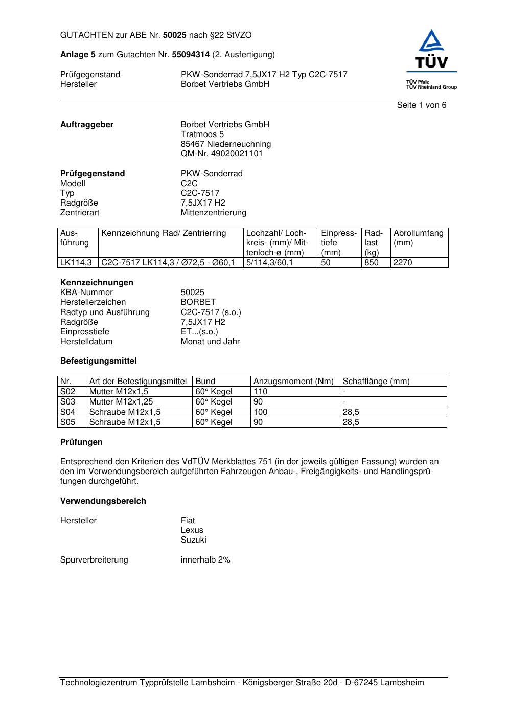 Dieses Gutachten (abe) bezieht sich auf die Alufelge Borbet C2C-751 7 in der Ausführung 7.5Jx17 ET 0, Mittenloch 0 mm (KBA 50025). Im PDF findest du typischerweise zulässige Reifengrößen, Auflagen/Anbauhinweise und – je nach Dokument – Hinweise zur Eintragung.
