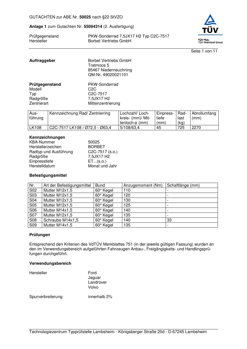 Dieses Gutachten (abe) bezieht sich auf die Alufelge Borbet C2C-751 7 in der Ausführung 7.5Jx17 ET 0, Mittenloch 0 mm (KBA 50025). Im PDF findest du typischerweise zulässige Reifengrößen, Auflagen/Anbauhinweise und – je nach Dokument – Hinweise zur Eintragung.