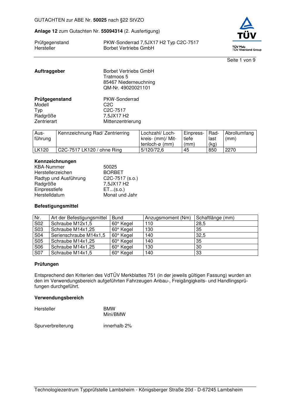 Dieses Gutachten (abe) bezieht sich auf die Alufelge Borbet C2C-751 7 in der Ausführung 7.5Jx17 ET 0, Mittenloch 0 mm (KBA 50025). Im PDF findest du typischerweise zulässige Reifengrößen, Auflagen/Anbauhinweise und – je nach Dokument – Hinweise zur Eintragung.