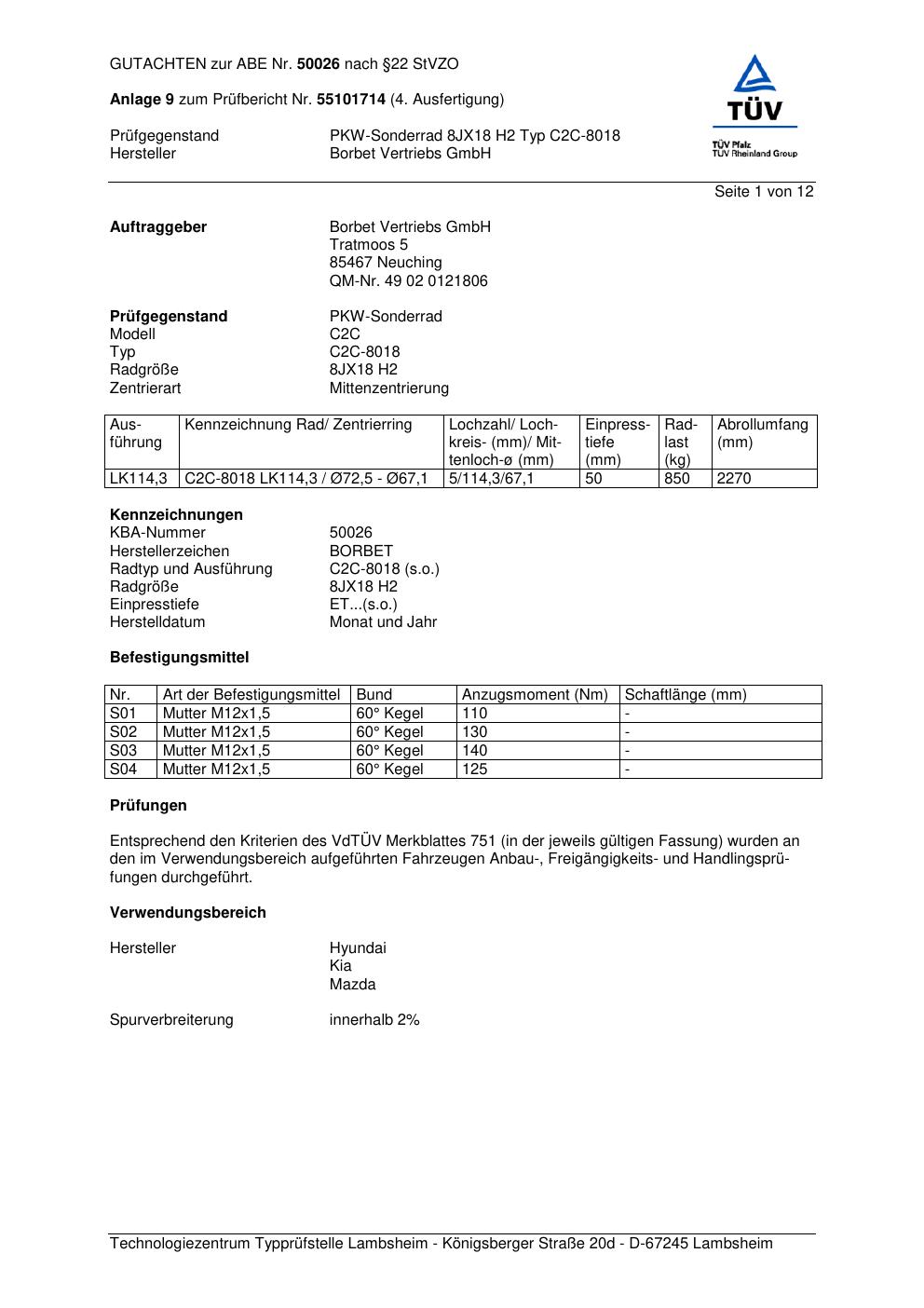 Dieses Gutachten (abe) bezieht sich auf die Alufelge Borbet C2C-8018 in der Ausführung 8Jx18 ET 0, Mittenloch 0 mm (KBA 50026). Im PDF findest du typischerweise zulässige Reifengrößen, Auflagen/Anbauhinweise und – je nach Dokument – Hinweise zur Eintragung.