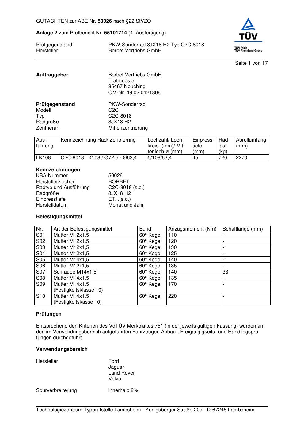 Dieses Gutachten (abe) bezieht sich auf die Alufelge Borbet C2C-8018 in der Ausführung 8Jx18 ET 0, Mittenloch 0 mm (KBA 50026). Im PDF findest du typischerweise zulässige Reifengrößen, Auflagen/Anbauhinweise und – je nach Dokument – Hinweise zur Eintragung.