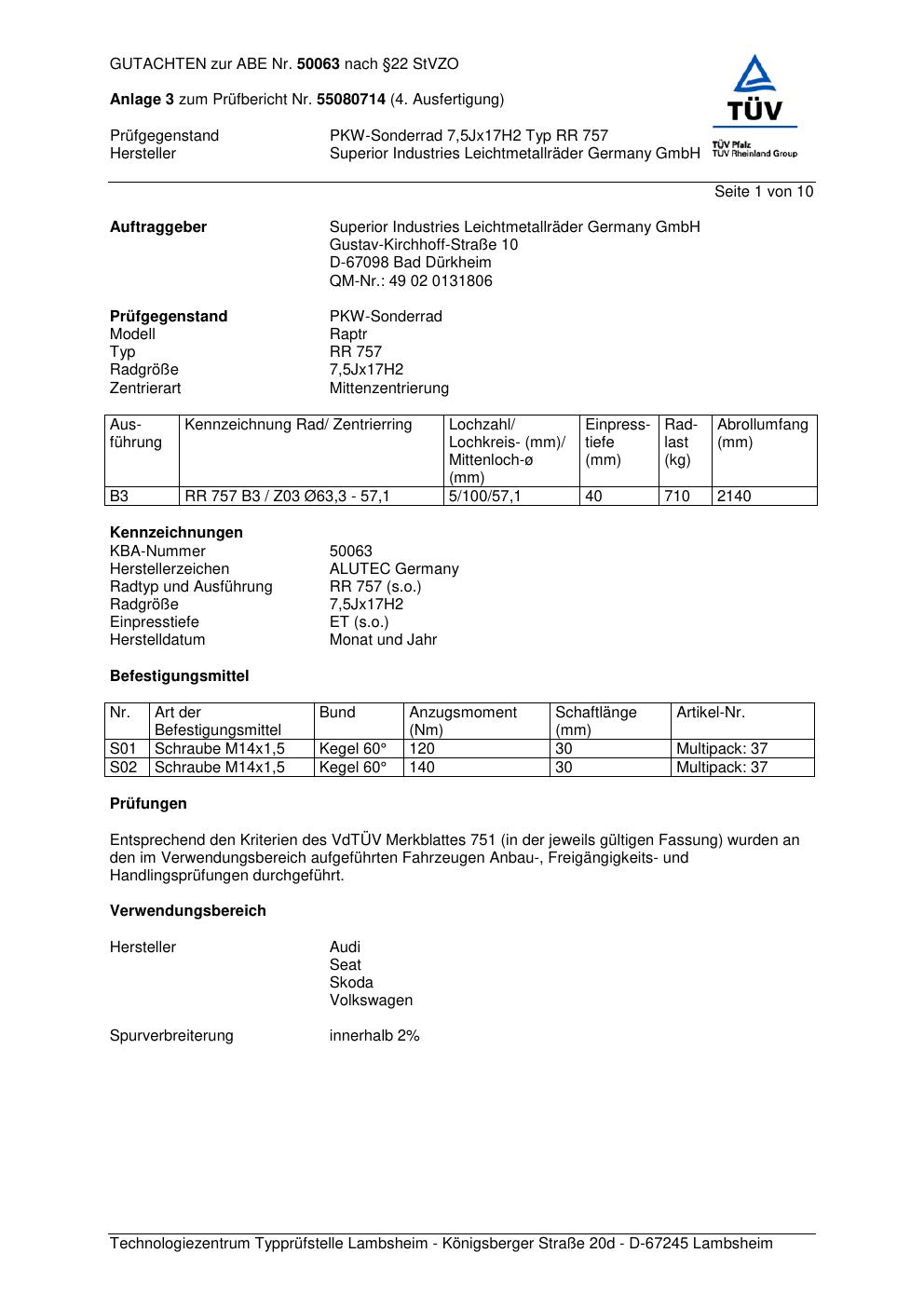 Dieses Gutachten (abe) bezieht sich auf die Alufelge ALUTEC RR 757 in der Ausführung 7.5Jx17 ET 0, Mittenloch 0 mm (KBA 50063). Im PDF findest du typischerweise zulässige Reifengrößen, Auflagen/Anbauhinweise und – je nach Dokument – Hinweise zur Eintragung.