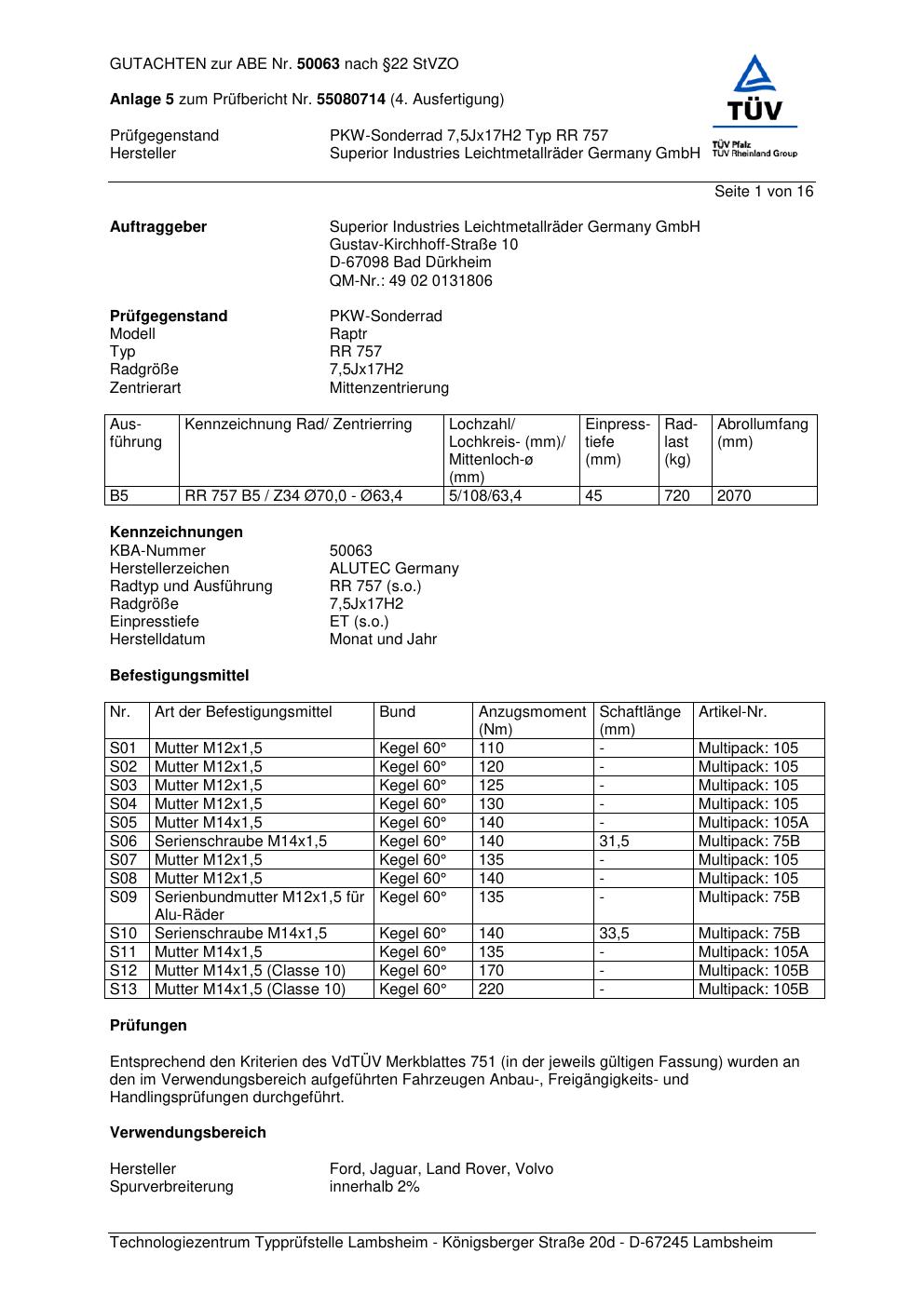 Dieses Gutachten (abe) bezieht sich auf die Alufelge ALUTEC RR 757 in der Ausführung 7.5Jx17 ET 0, Mittenloch 0 mm (KBA 50063). Im PDF findest du typischerweise zulässige Reifengrößen, Auflagen/Anbauhinweise und – je nach Dokument – Hinweise zur Eintragung.