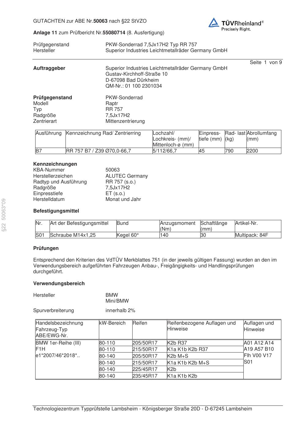 Dieses Gutachten (abe) bezieht sich auf die Alufelge ALUTEC RR 757 in der Ausführung 7.5Jx17 ET 0, Mittenloch 0 mm (KBA 50063). Im PDF findest du typischerweise zulässige Reifengrößen, Auflagen/Anbauhinweise und – je nach Dokument – Hinweise zur Eintragung.